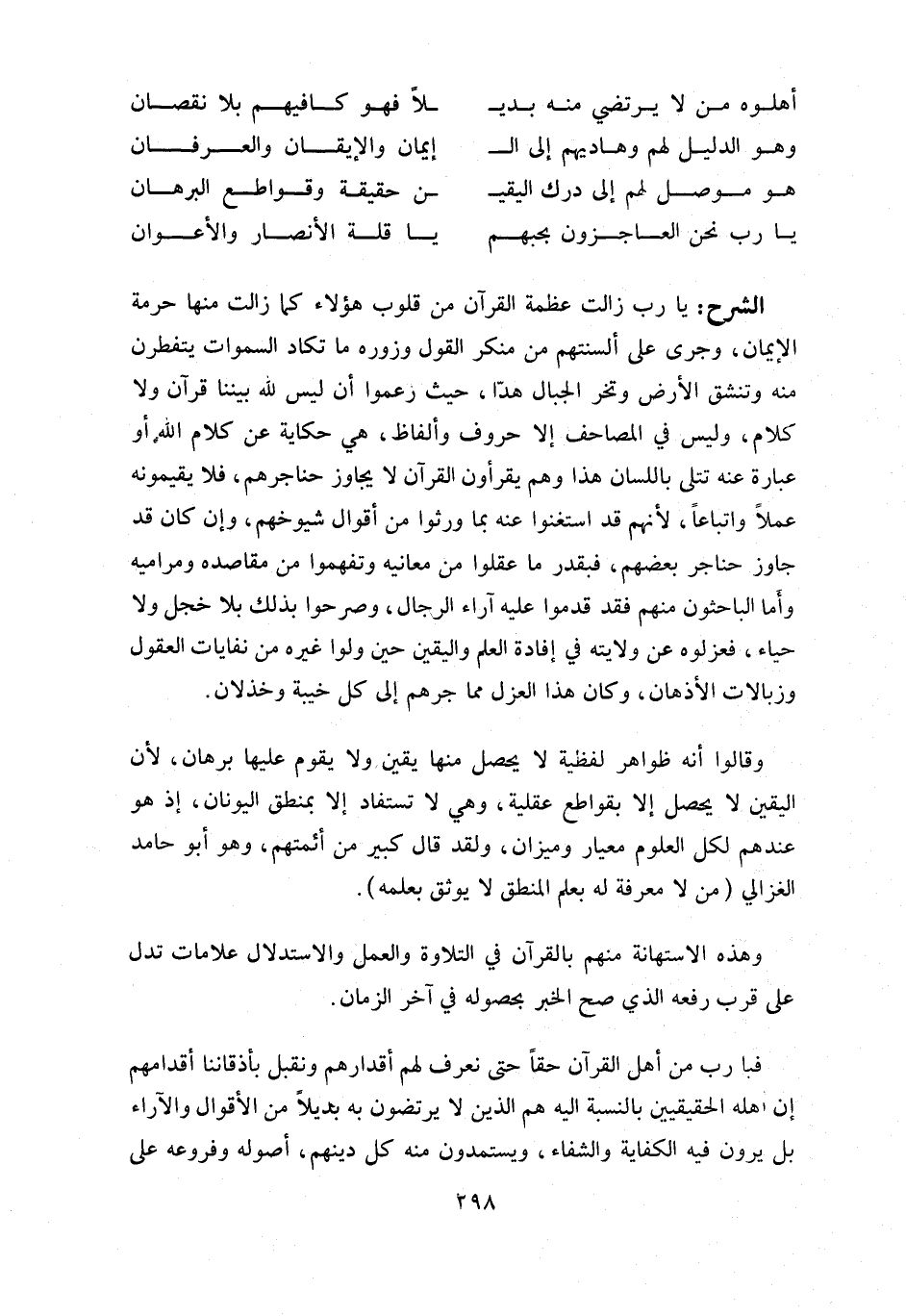 يا رب زالت عظمة القرآن من قلوب هؤلاء كما زالت منها حرمة الإيمان، وجرى على ألسنتهم من منكر القول وزوره ما تكاد السموات يتفطرن منه وتنشق الأرض وتخر الجبال هدّا، حيث زعموا أن ليس للّه بيننا قرآن ولا كلام، وليس في المصاحف إلا حروف وألفاظ، هي حكاية عن كلام اللّه أو عبارة عنه تتلى باللسان هذا وهم يقرءون القرآن لا يجاوز حناجرهم، فلا يقيمونه عملا واتباعا، لأنهم قد استغنوا عنه بما ورثوا من أقوال شيوخهم، وإن كان قد جاوز حناجر بعضهم، فبقدر ما عقلوا من معانيه وتفهموا من مقاصده ومراميه وأما الباحثون منهم فقد قدموا عليه آراء الرجال، وصرحوا بذلك بلا خجل ولا حياء، فعزلوه عن ولايته في إفادة العلم واليقين حين ولوا غيره من نفايات العقول وزبالات الأذهان، وكان هذا العزل مما جرهم إلى كل خيبة وخذلان.