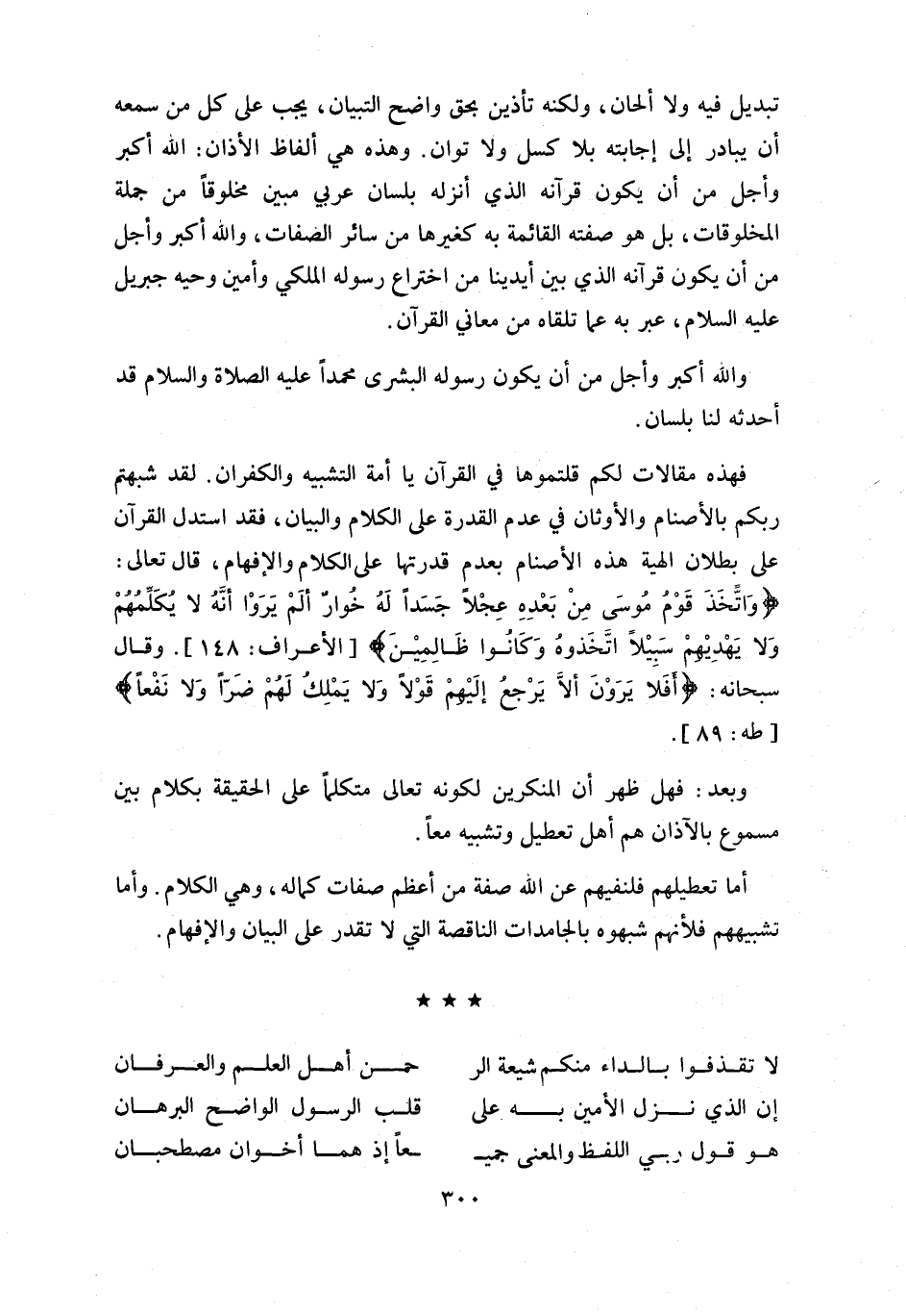فهذه مقالات لكم قلتموها في القرآن يا أمة التشبيه والكفران. لقد شبهتم ربكم بالأصنام والأوثان في عدم القدرة على الكلام والبيان، فقد استدل القرآن على بطلان إلهية هذه الأصنام بعدم قدرتها على الكلام والإفهام، قال تعالى: