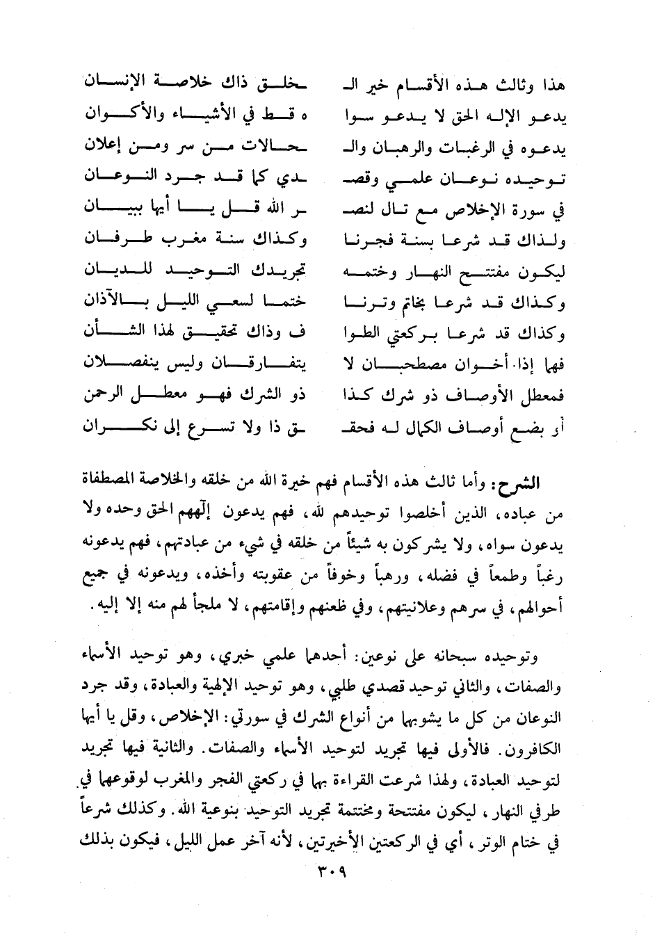 و توحيده سبحانه على نوعين: أحدهما علمي خبري، وهو توحيد الأسماء والصفات، والثاني توحيد قصدي طلبي، وهو توحيد الإلهية والعبادة، وقد جرد النوعان من كل ما يشوبهما من أنواع الشرك في سورتي: الإخلاص، وقل يا أيها الكافرون. فالأولى فيها تجريد لتوحيد الأسماء والصفات. والثانية فيها تجريد لتوحيد العبادة، ولهذا شرعت القراءة بهما في ركعتي الفجر والمغرب لوقوعهما في طرفي النهار، ليكون مفتتحة ومختتمة تجريد التوحيد بنوعية اللّه. وكذلك شرعا في ختام الوتر، أي في الركعتين الأخيرتين، لأنه آخر عمل الليل، فيكون بذلك
