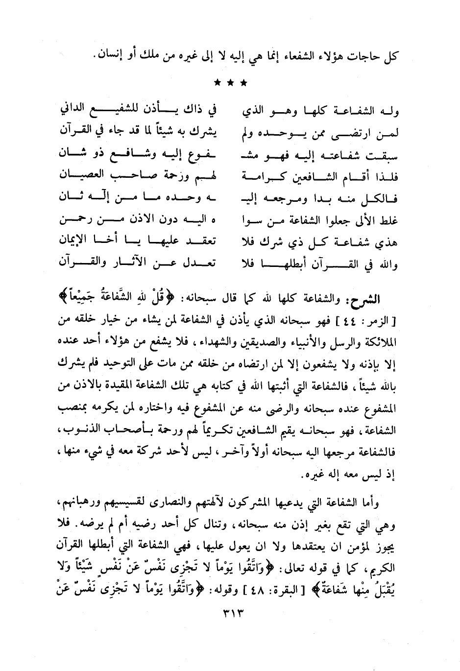 والشفاعة كلها للّه كما قال سبحانه: قُلْ لِلَّهِ الشَّفاعَةُ جَمِيعاً [الزمر: 44] فهو سبحانه الذي يأذن في الشفاعة لمن يشاء من خيار خلقه من الملائكة والرسل والأنبياء والصديقين والشهداء، فلا يشفع من هؤلاء أحد عنده إلا بإذنه ولا يشفعون إلا لمن ارتضاه من خلقه ممن مات على التوحيد فلم يشرك باللّه شيئا، فالشفاعة التي أثبتها اللّه في كتابه هي تلك الشفاعة المقيدة بالاذن من المشفوع عنده سبحانه والرضى منه عن المشفوع فيه واختاره لمن يكرمه بمنصب الشفاعة، فهو سبحانه يقيم الشافعين تكريما لهم ورحمة بأصحاب الذنوب، فالشفاعة مرجعها إليه سبحانه أولا وآخر، ليس لأحد شركة معه في شي ء منها، إذ ليس معه إله غيره.