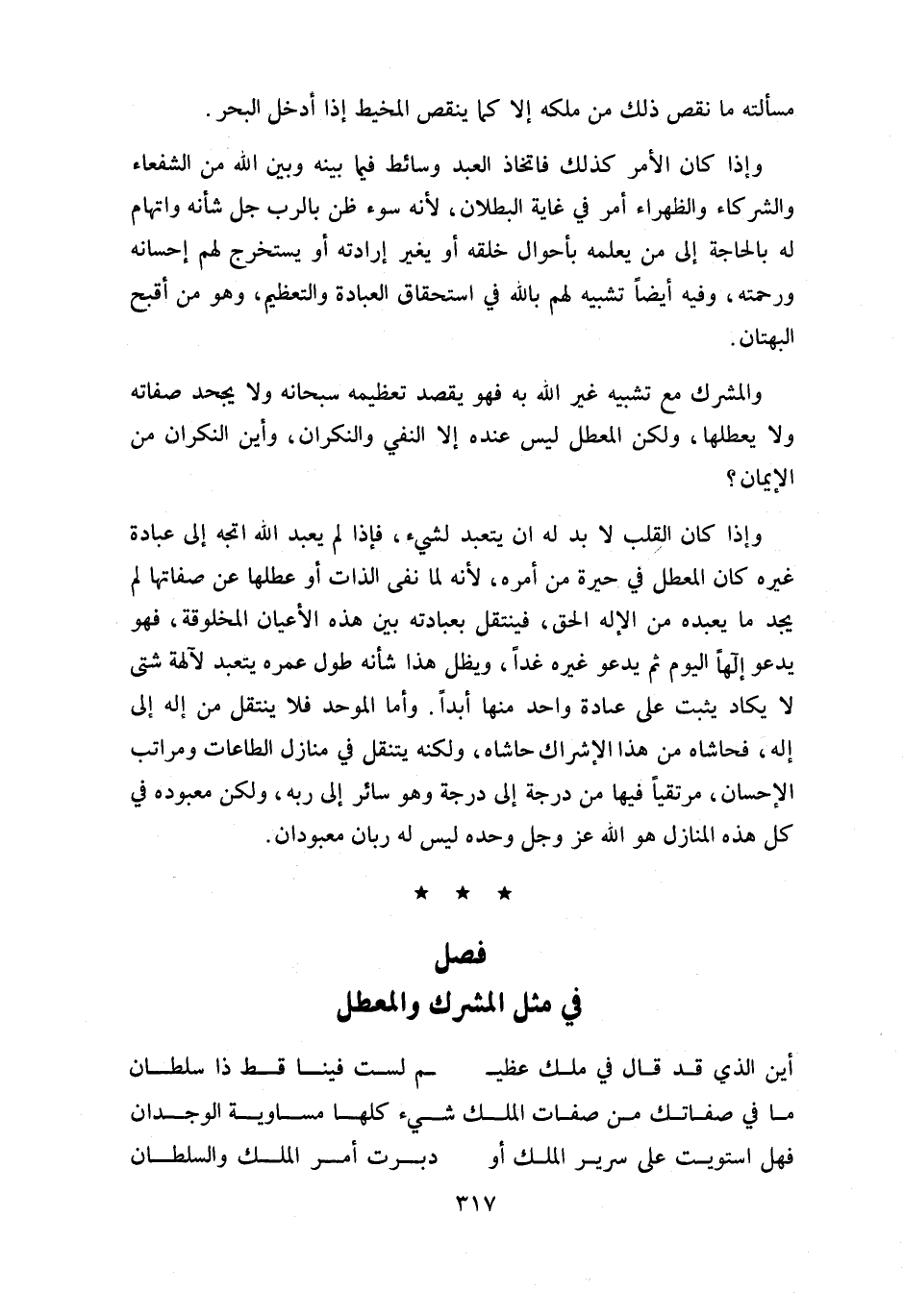 و المشرك مع تشبيه غير اللّه به فهو يقصد تعظيمه سبحانه ولا يجحد صفاته ولا يعطلها، ولكن المعطل ليس عنده إلا النفي والنكران، وأين النكران من الإيمان؟