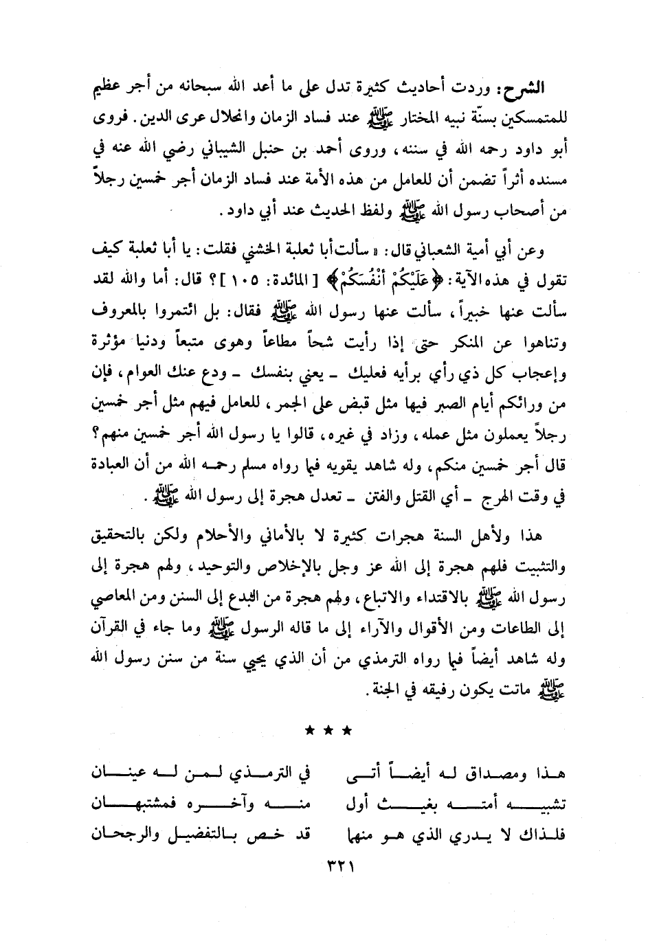 وردت أحاديث كثيرة تدل على ما أعد اللّه سبحانه من أجر عظيم للمتمسكين بسنّة نبيه المختار صلّى اللّه عليه وسلّم عند فساد الزمان وانحلال عرى الدين. فروى أبو داود رحمه اللّه في سننه، وروى أحمد بن حنبل الشيباني رضي اللّه عنه في مسنده أثرا تضمن أن للعامل من هذه الأمة عند فساد الزمان أجر خمسين رجلا من أصحاب رسول اللّه صلّى اللّه عليه وسلّم ولفظ الحديث عند أبي داود.