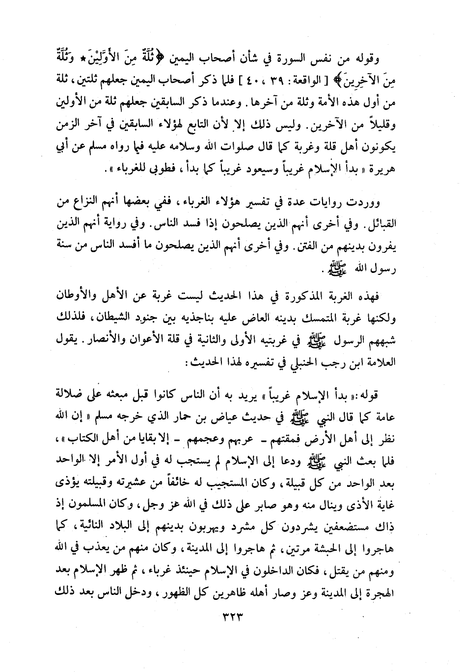 و قوله من نفس السورة في شأن أصحاب اليمين ثُلَّةٌ مِنَ الْأَوَّلِينَ وثُلَّةٌ مِنَ الْآخِرِينَ [الواقعة: 39، 40] فلما ذكر أصحاب اليمين جعلهم ثلتين، ثلة من أول هذه الأمة وثلة من آخرها. وعند ما ذكر السابقين جعلهم ثلة من الأولين وقليلا من الآخرين. وليس ذلك إلا لأن التابع لهؤلاء السابقين في آخر الزمن يكونون أهل قلة وغربة كما قال صلوات اللّه وسلامه عليه فيما رواه مسلم عن أبي هريرة «بدأ الإسلام غريبا وسيعود غريبا كما بدأ، فطوبى للغرباء».