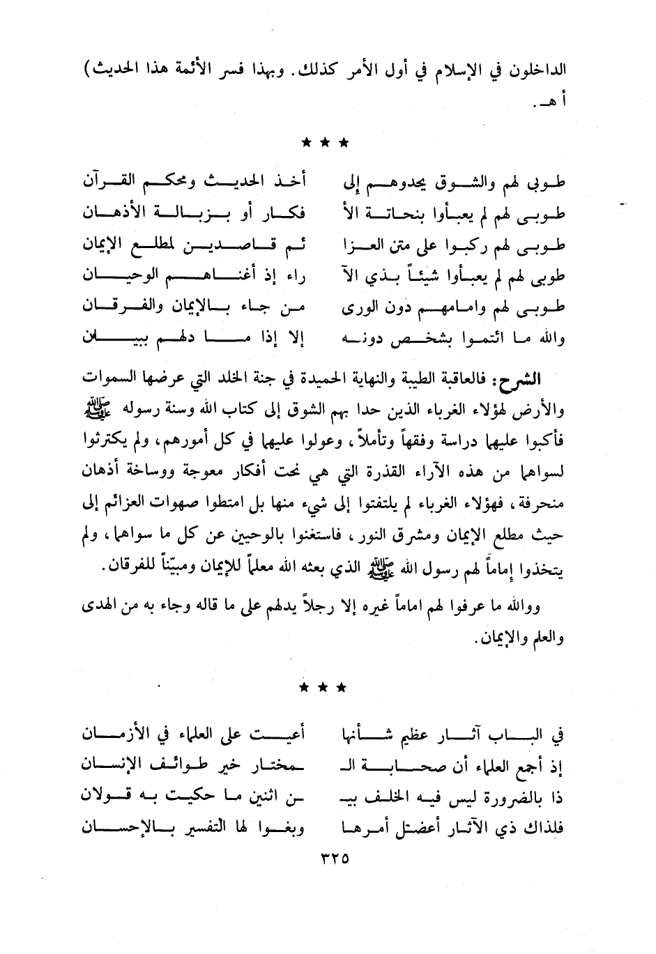فالعاقبة الطيبة والنهاية الحميدة في جنة الخلد التي عرضها السموات والأرض لهؤلاء الغرباء الذين حدا بهم الشوق إلى كتاب اللّه وسنة رسوله صلّى اللّه عليه وسلّم فأكبوا عليهما دراسة وفقها وتأملا، وعولوا عليهما في كل أمورهم، ولم يكترثوا لسواهما من هذه الآراء القذرة التي هي نحت أفكار معوجة ووساخة أذهان منحرفة، فهؤلاء الغرباء لم يلتفتوا إلى شي ء منها بل امتطوا صهوات العزائم إلى حيث مطلع الإيمان ومشرق النور، فاستغنوا بالوحيين عن كل ما سواهما، ولم يتخذوا إماما لهم رسول اللّه صلّى اللّه عليه وسلّم الذي بعثه اللّه معلما للإيمان ومبيّنا للفرقان.