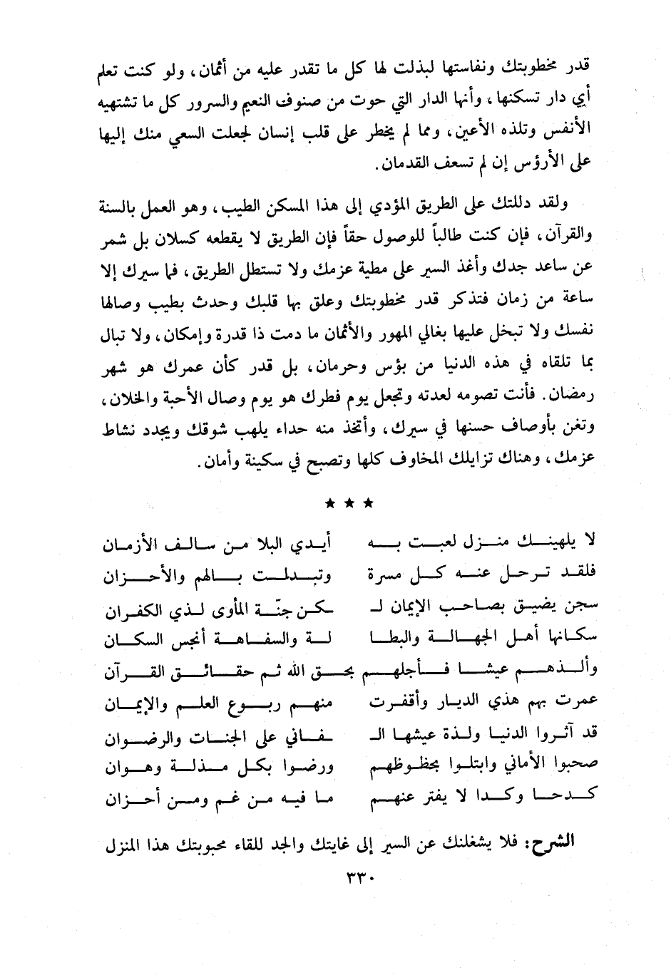 و لقد دللتك على الطريق المؤدي إلى هذا المسكن الطيب، وهو العمل بالسنة والقرآن، فإن كنت طالبا للوصول حقا فإن الطريق لا يقطعه كسلان بل شمر عن ساعد جدك وأغذ السير على مطية عزمك ولا تستطل الطريق، فما سيرك إلا ساعة من زمان فتذكر قدر مخطوبتك وعلق بها قلبك وحدث بطيب وصالها نفسك ولا تبخل عليها بغالي المهور والأثمان ما دمت ذا قدرة وإمكان، ولا تبال بما تلقاه في هذه الدنيا من بؤس وحرمان، بل قدر كأن عمرك هو شهر رمضان. فأنت تصومه لعدته وتجعل يوم فطرك هو يوم وصال الأحبة والخلان، وتغن بأوصاف حسنها في سيرك، وأتخذ منه حداء يلهب شوقك ويجدد نشاط عزمك، وهناك تزايلك المخاوف كلها وتصبح في سكينة وأمان.