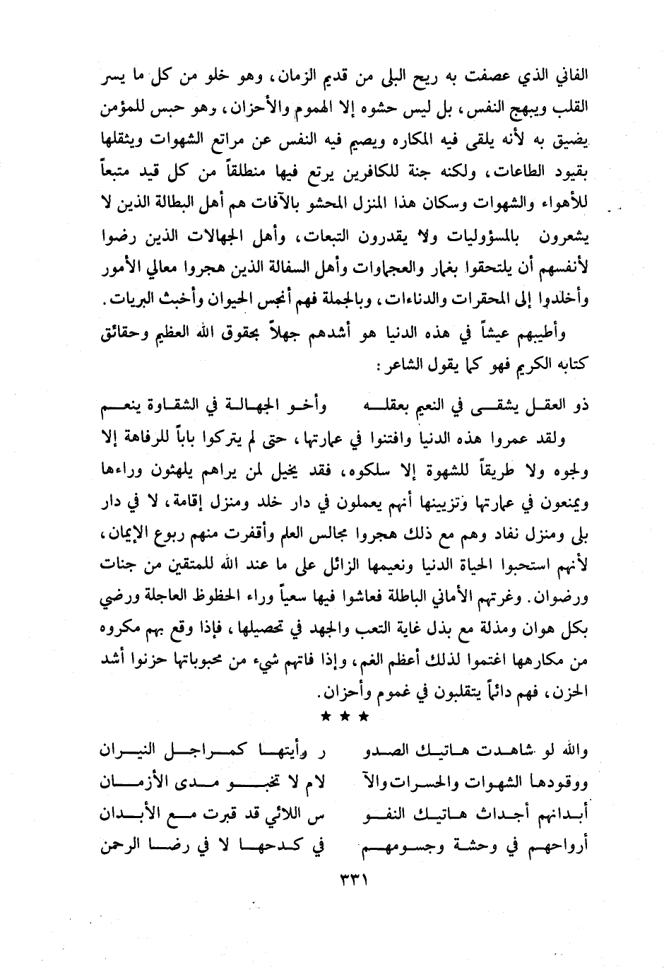 الفاني الذي عصفت به ريح البلى من قديم الزمان، وهو خلو من كل ما يسر القلب ويبهج النفس، بل ليس حشوه إلا الهموم والأحزان، وهو حبس للمؤمن يضيق به لأنه يلقى فيه المكاره ويصيم فيه النفس عن مراتع الشهوات ويثقلها بقيود الطاعات، ولكنه جنة للكافرين يرتع فيها منطلقا من كل قيد متبعا للأهواء والشهوات وسكان هذا المنزل المحشو بالآفات هم أهل البطالة الذين لا يشعرون بالمسئوليات ولا يقدرون التبعات، وأهل الجهالات الذين رضوا لأنفسهم أن يلتحقوا بغمار والعجماوات وأهل السفالة الذين هجروا معالي الأمور وأخلدوا إلى المحقرات والدناءات، وبالجملة فهم أنجس الحيوان وأخبث البريات.