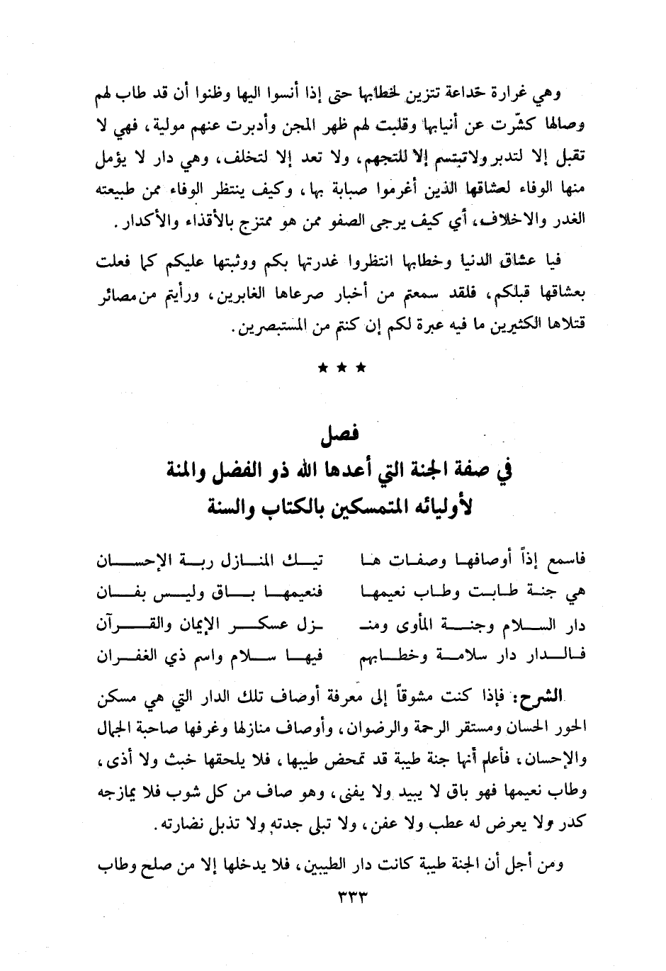 فإذا كنت مشوقا إلى معرفة أوصاف تلك الدار التي هي مسكن الحور الحسان ومستقر الرحمة والرضوان، وأوصاف منازلها وغرفها صاحبة الجمال والإحسان، فأعلم أنها جنة طيبة قد تمحض طيبها، فلا يلحقها خبث ولا أذى، وطاب نعيمها فهو باق لا يبيد ولا يفنى، وهو صاف من كل شوب فلا يمازجه كدر ولا يعرض له عطب ولا عفن، ولا تبلى جدته ولا تذبل نضارته.