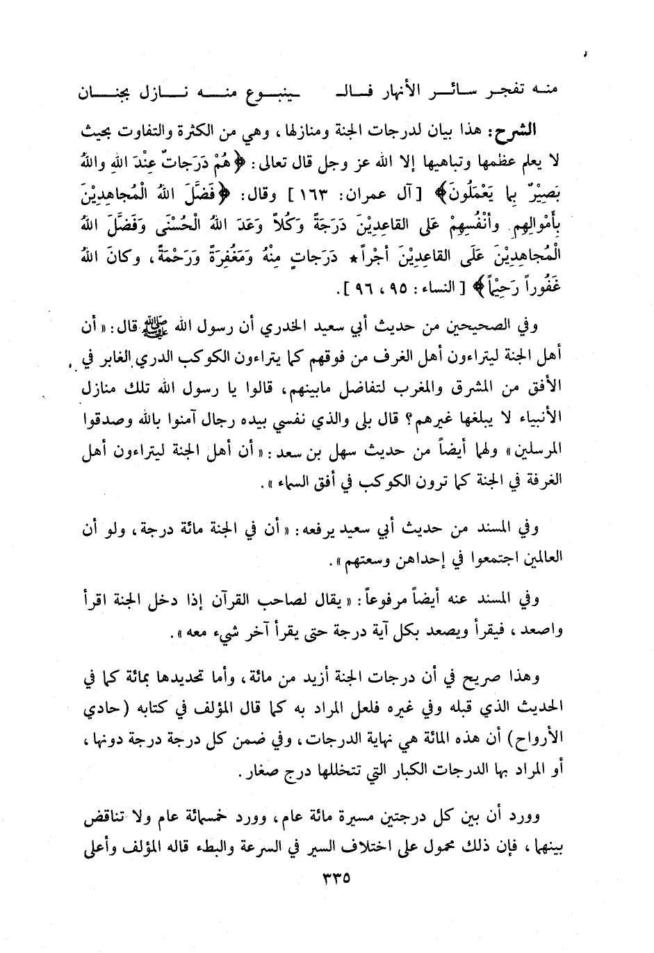 و هذا صريح في أن درجات الجنة أزيد من مائة، وأما تحديدها بمائة كما في الحديث الذي قبله وفي غيره فلعل المراد به كما قال المؤلف في كتابه (حادي الأرواح) أن هذه المائة هي نهاية الدرجات، وفي ضمن كل درجة درجة دونها، أو المراد بها الدرجات الكبار التي تتخللها درج صغار.