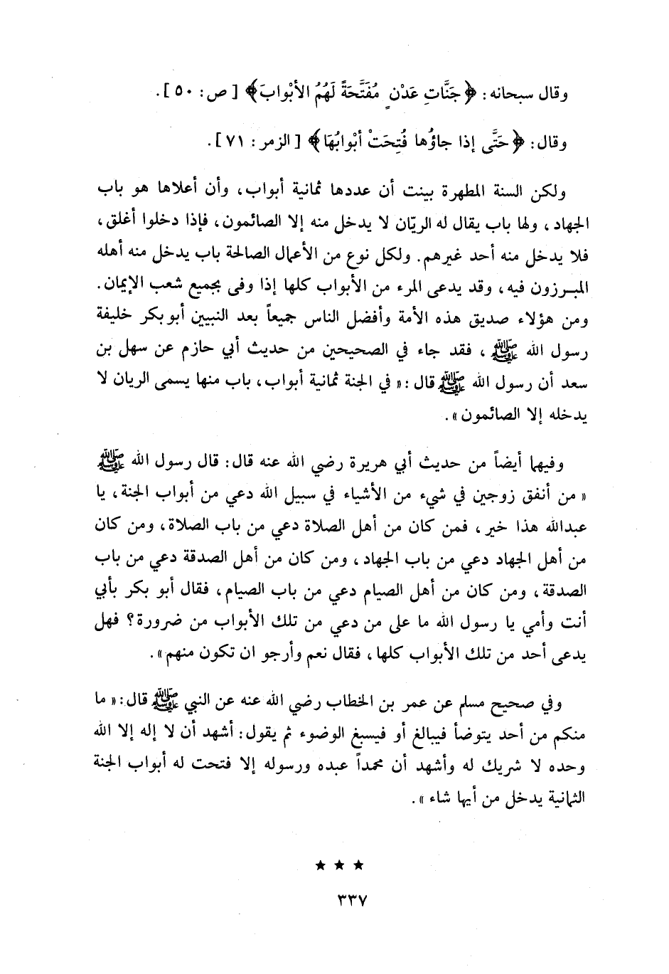 و فيهما أيضا من حديث أبي هريرة رضي اللّه عنه قال: قال رسول اللّه صلّى اللّه عليه وسلّم «من أنفق زوجين في شي ء من الأشياء في سبيل اللّه دعي من أبواب الجنة، يا عبد اللّه هذا خير، فمن كان من أهل الصلاة دعي من باب الصلاة، ومن كان من أهل الجهاد دعي من باب الجهاد، ومن كان من أهل الصدقة دعي من باب الصدقة، ومن كان من أهل الصيام دعي من باب الصيام، فقال أبو بكر بأبي أنت وأمي يا رسول اللّه ما على من دعي من تلك الأبواب من ضرورة؟ فهل يدعى أحد من تلك الأبواب كلها، فقال نعم وأرجو ان تكون منهم».