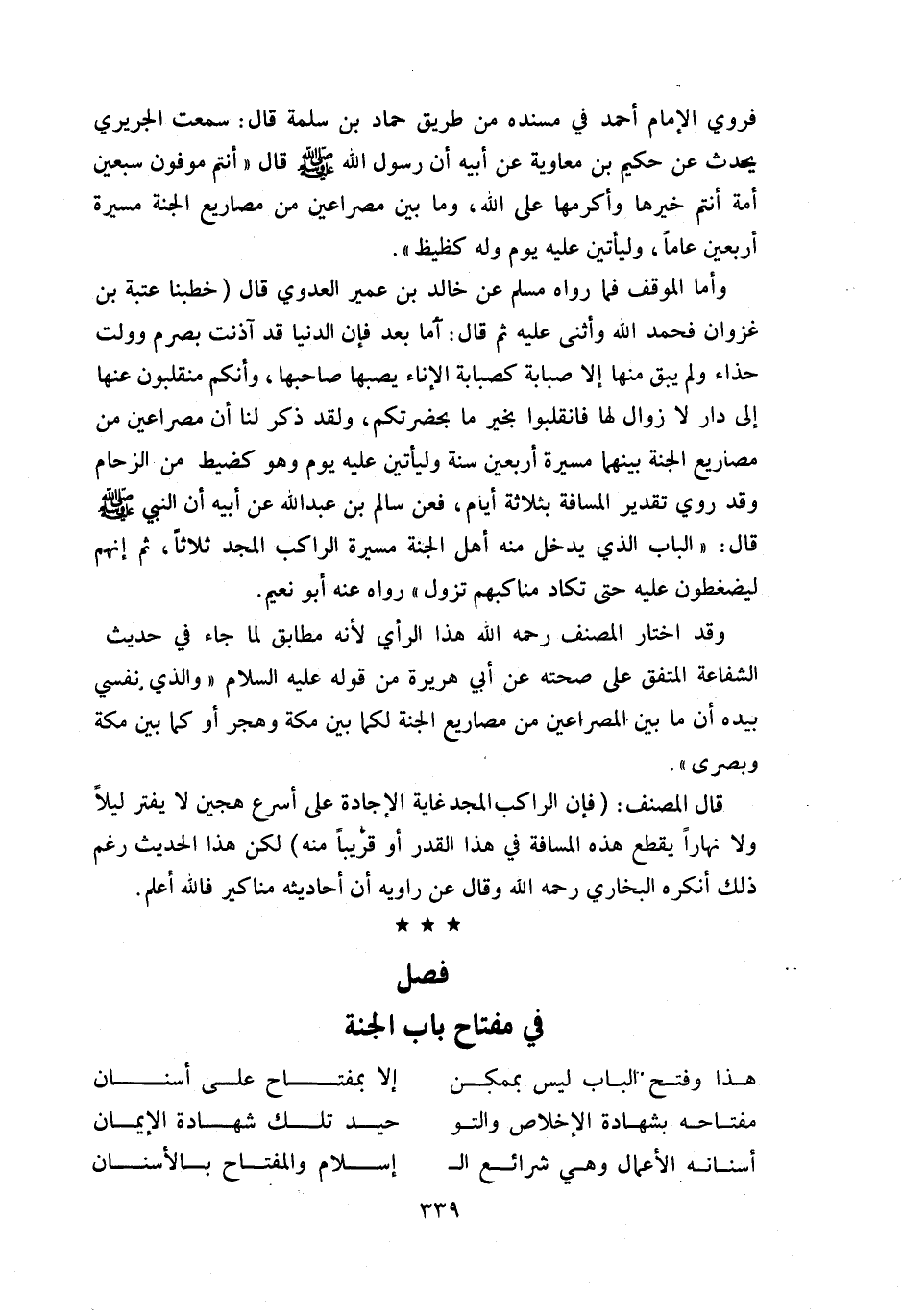و أما الموقف فما رواه مسلم عن خالد بن عمير العدوي قال (خطبنا عتبة بن غزوان فحمد اللّه وأثنى عليه ثم قال: أما بعد فإن الدنيا قد آذنت بصرم وولت حذاء ولم يبق منها إلا صبابة كصبابة الإناء يصبها صاحبها، وأنكم منقلبون عنها إلى دار لا زوال لها فانقلبوا بخير ما بحضرتكم، ولقد ذكر لنا أن مصراعين من مصاريع الجنة بينهما مسيرة أربعين سنة وليأتين عليه يوم وهو كظيظ من الزحام وقد روي تقدير المسافة بثلاثة أيام، فعن سالم بن عبد اللّه عن أبيه أن النبي صلّى اللّه عليه وسلّم قال: «الباب الذي يدخل منه أهل الجنة مسيرة الراكب المجد ثلاثا، ثم إنهم ليضغطون عليه حتى تكاد مناكبهم تزول» رواه عنه أبو نعيم.