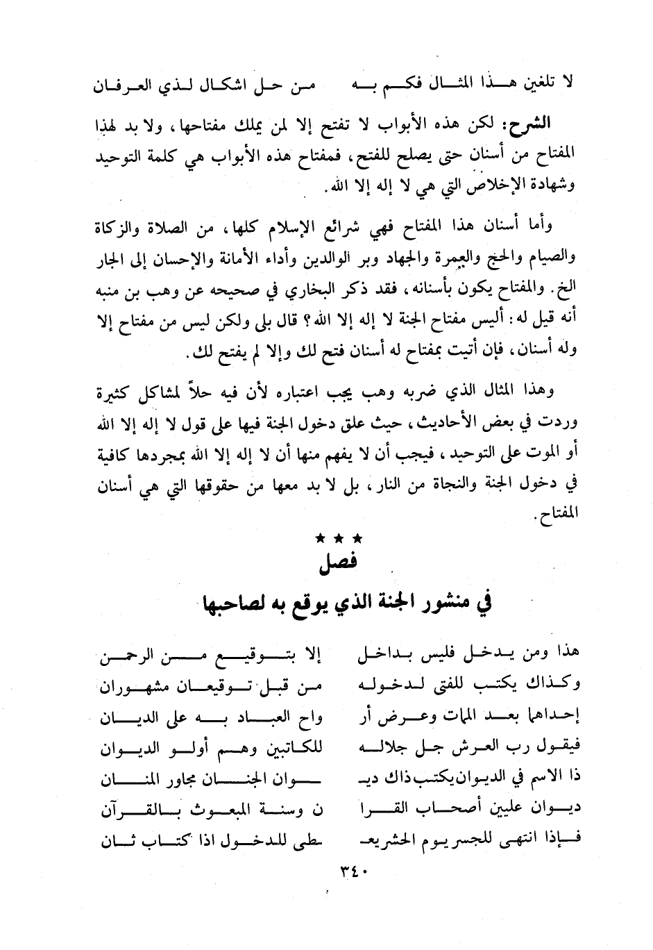 و أما أسنان هذا المفتاح فهي شرائع الإسلام كلها، من الصلاة والزكاة والصيام والحج والعمرة والجهاد وبر الوالدين وأداء الأمانة والإحسان إلى الجار الخ. والمفتاح يكون بأسنانه، فقد ذكر البخاري في صحيحه عن وهب بن منبه أنه قيل له: أ ليس مفتاح الجنة لا إله إلا اللّه؟ قال بلى ولكن ليس من مفتاح إلا وله أسنان، فإن أتيت بمفتاح له أسنان فتح لك وإلا لم يفتح لك.