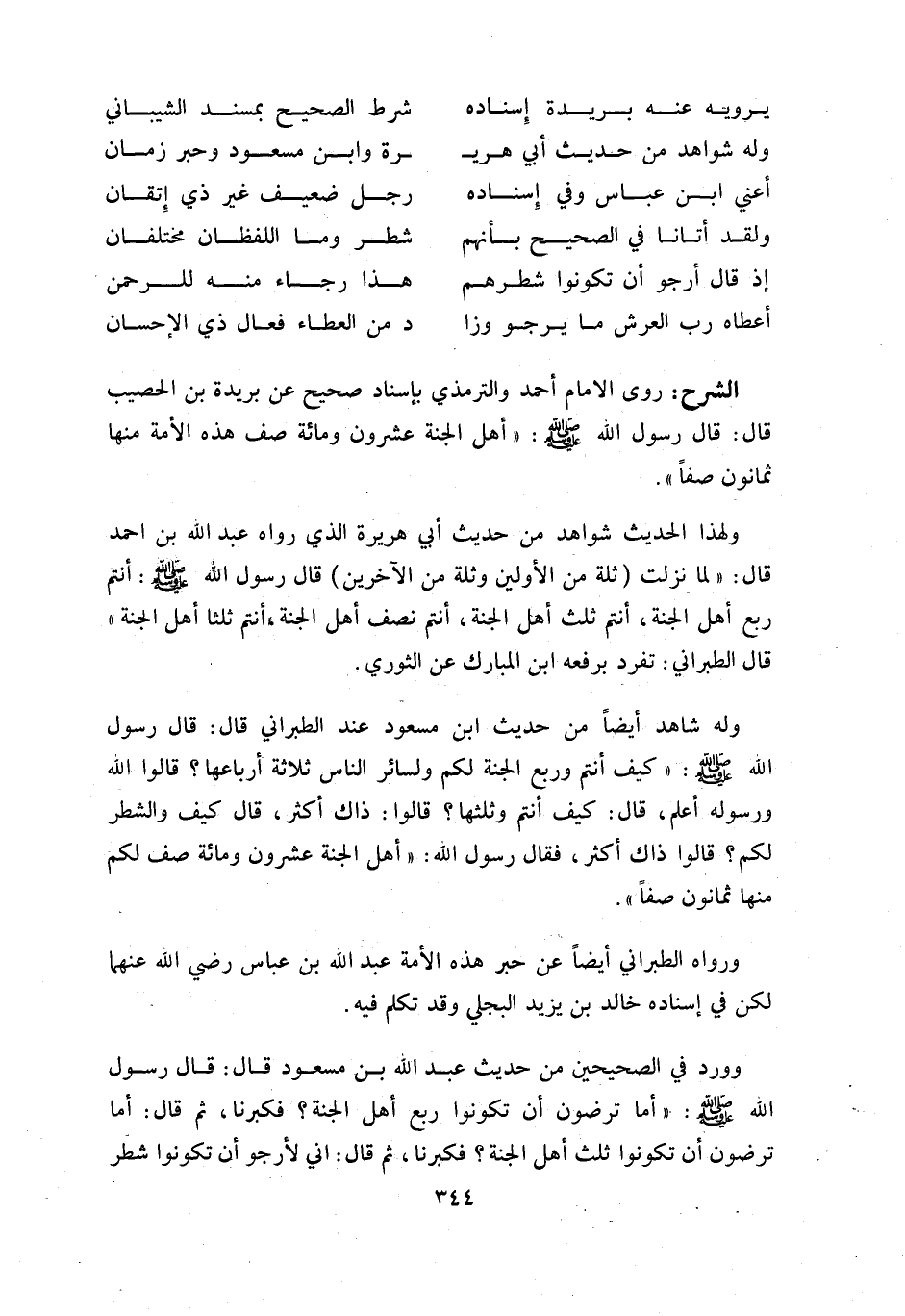 و ورد في الصحيحين من حديث عبد اللّه بن مسعود قال: قال رسول اللّه صلّى اللّه عليه وسلّم: «أ ما ترضون أن تكونوا ربع أهل الجنة؟ فكبرنا، ثم قال: أ ما ترضون أن تكونوا ثلث أهل الجنة؟ فكبرنا، ثم قال: اني لأرجو أن تكونوا شطر