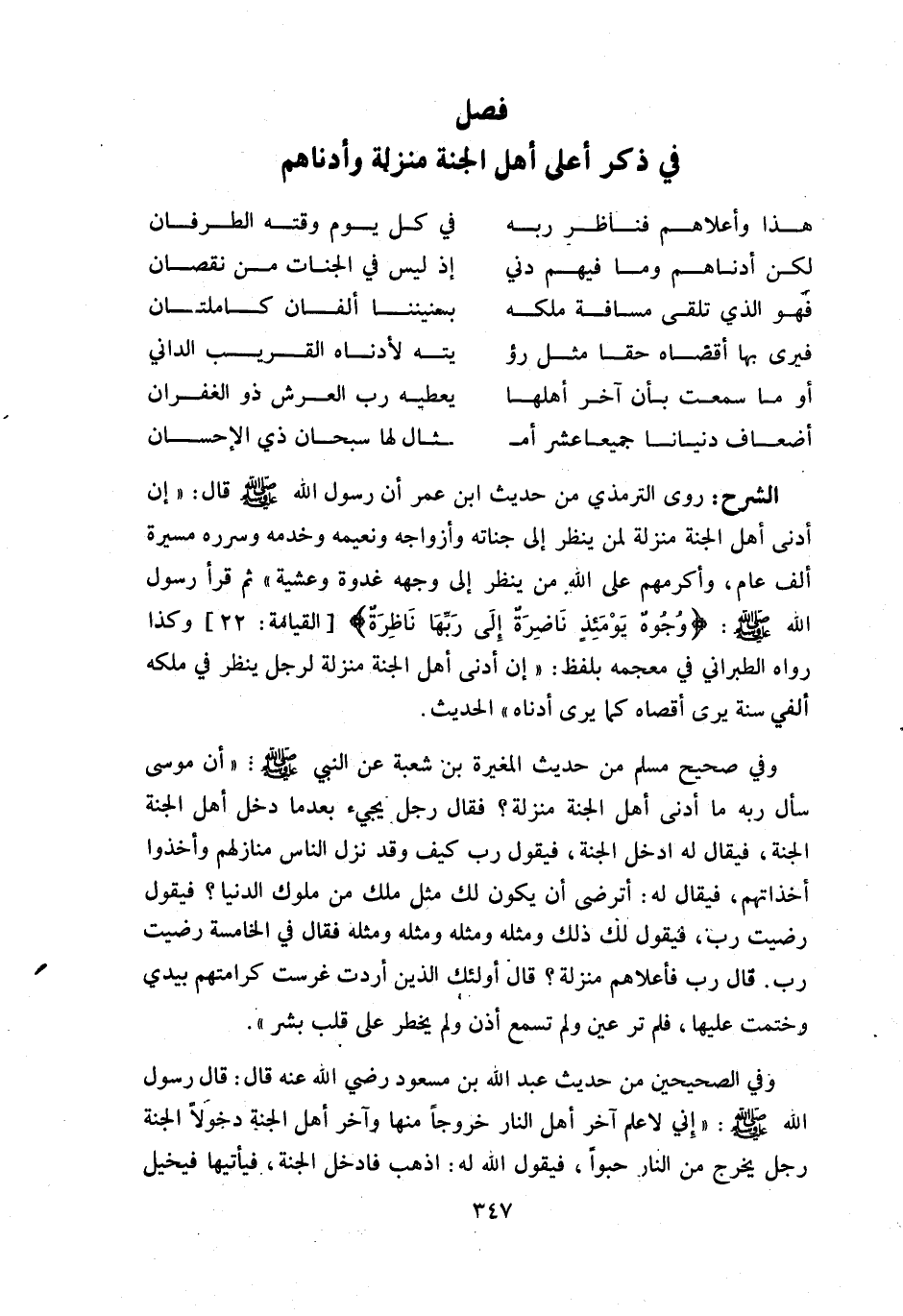 روى الترمذي من حديث ابن عمر أن رسول اللّه صلّى اللّه عليه وسلّم قال: «إن أدنى أهل الجنة منزلة لمن ينظر إلى جناته وأزواجه ونعيمه وخدمه وسرره مسيرة ألف عام، وأكرمهم على اللّه من ينظر إلى وجهه غدوة وعشية» ثم قرأ رسول اللّه صلّى اللّه عليه وسلّم: وُجُوهٌ يَوْمَئِذٍ ناضِرَةٌ إِلى رَبِّها ناظِرَةٌ [القيامة: 22] وكذا رواه الطبراني في معجمه بلفظ: «إن أدنى أهل الجنة منزلة لرجل ينظر في ملكه ألفي سنة يرى أقصاه كما يرى أدناه» الحديث.