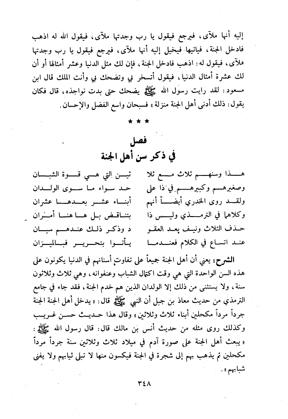 يعني أن أهل الجنة جميعا على تفاوت أسنانهم في الدنيا يكونون على هذه السن الواحدة التي هي وقت اكتمال الشباب وعنفوانه، وهي ثلاث وثلاثون سنة، ولا يستثنى من ذلك إلا الولدان الذين هم خدم الجنة، فقد جاء في جامع الترمذي من حديث معاذ بن جبل أن النبي صلّى اللّه عليه وسلّم قال: «يدخل أهل الجنة الجنة جردا مردا مكحلين أبناء ثلاث وثلاثين» وقال هذا حديث حسن غريب وكذلك روى مثله من حديث أنس بن مالك قال: قال رسول اللّه صلّى اللّه عليه وسلّم: