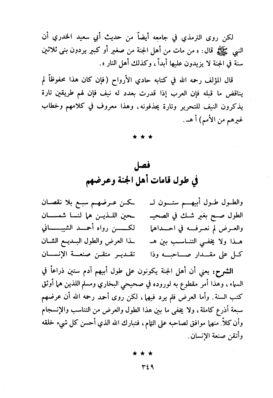 يعني أن أهل الجنة يكونون على طول أبيهم آدم ستين ذراعا في السماء، وهذا أمر مقطوع به لوروده في صحيحي البخاري ومسلم اللذين هما أوثق كتب السنة. وأما العرض فلم يرد فيهما، لكن روى أحمد رحمه اللّه أن عرضهم سبعة أذرع كاملة، ولا يخفى ما بين هذا الطول والعرض من التناسب والانسجام وأن كلا منهما موافق لصاحبه على التمام، فتبارك اللّه الذي أحسن كل شي ء خلقه وأتقن صنعة الإنسان.