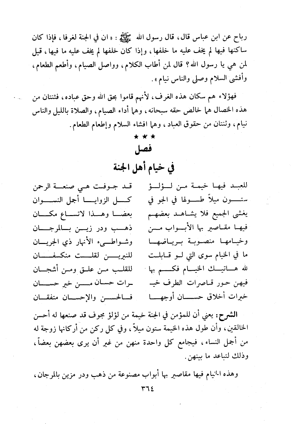 رباح عن ابن عباس قال، قال رسول اللّه صلّى اللّه عليه وسلّم: «إن في الجنة لغرفا، فإذا كان ساكنها فيها لم يخف عليه ما خلفها، وإذا كان خلفها لم يخف عليه ما فيها، قيل لمن هي يا رسول اللّه؟ قال لمن أطاب الكلام، وواصل الصيام، وأطعم الطعام، وأفشى السلام وصلى والناس نيام».
