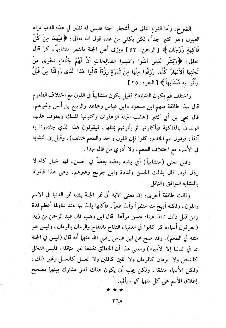 و قالت طائفة أخرى: إن معنى الآية أن ثمر الجنة يشبه ثمر الدنيا في الاسم واللون، ولكنه أبهج منه منظرا وألذ طعما، فآكلها يلتذ بها عند تناولها أعظم لذة ومن قبل ذلك تلتذ عيناه بحسن مرآها. قال ابن وهب قال عبد الرحمن بن زيد (يعرفون أسماءه كما كانوا في الدنيا، التفاح بالتفاح والرمان بالرمان، وليس هو مثله في الطعم). وقد صح عن ابن عباس رضي اللّه عنهما أنه قال (ليس في الجنة مما في الدنيا إلا الأسماء) ومعنى هذا أن الحقائق مختلفة غير متماثلة، فليس النخل كالنخل ولا الرمان كالرمان ولا اللبن كاللبن ولا العسل كالعسل وغير ذلك، ولكن الأسماء متفقة، ولكن يجب أن يكون هناك قدر مشترك بينهما يصحح إطلاق الاسم على كل منهما كما سيأتي.