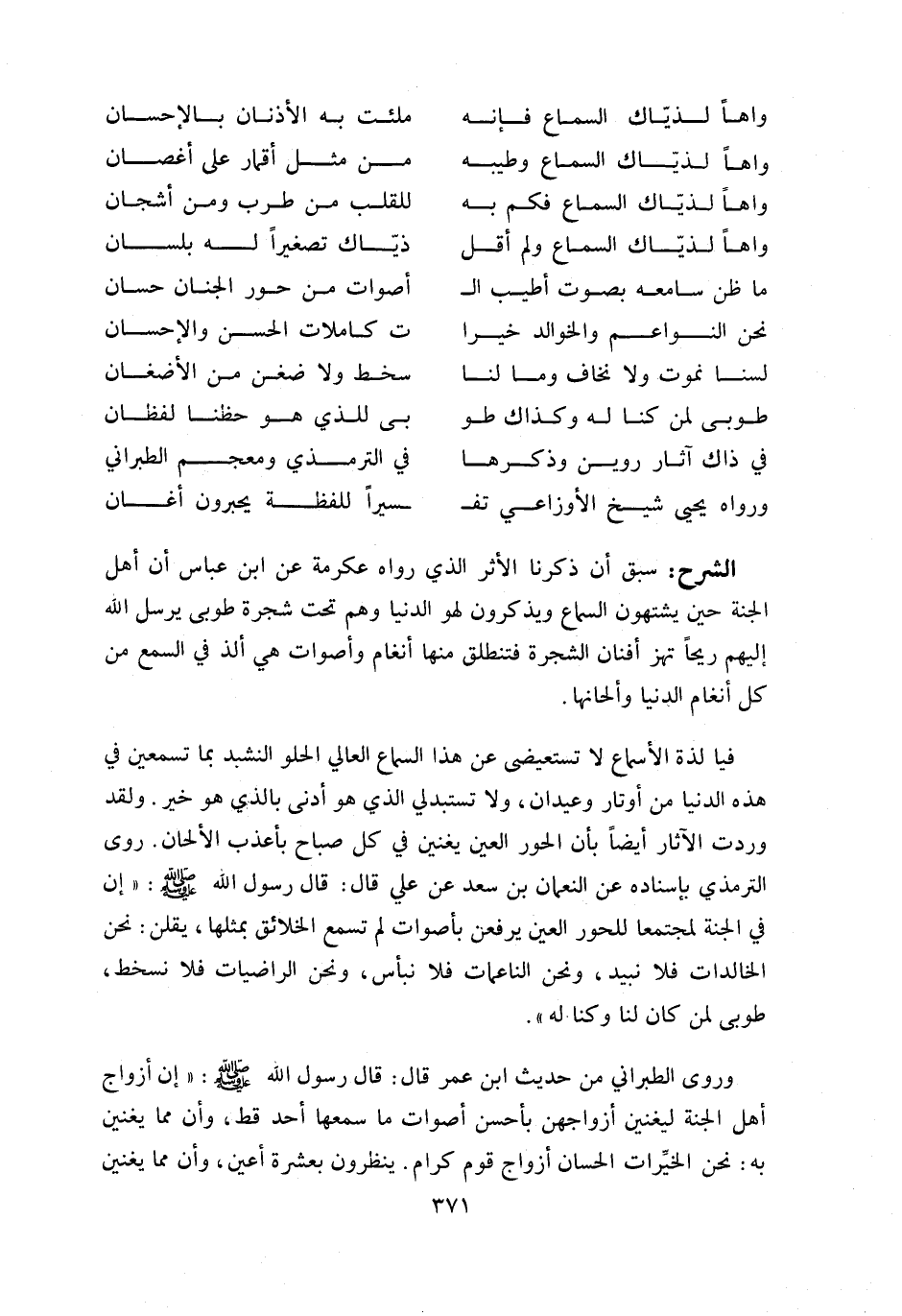 فيا لذة الأسماع لا تستعيضى عن هذا السماع العالي الحلو النشيد بما تسمعين في هذه الدنيا من أوتار وعيدان، ولا تستبدلي الذي هو أدنى بالذي هو خير. ولقد وردت الآثار أيضا بأن الحور العين يغنين في كل صباح بأعذب الألحان. روى الترمذي بإسناده عن النعمان بن سعد عن علي قال: قال رسول اللّه صلّى اللّه عليه وسلّم: «إن في الجنة لمجتمعا للحور العين يرفعن بأصوات لم تسمع الخلائق بمثلها، يقلن: نحن الخالدات فلا نبيد، ونحن الناعمات فلا نبأس، ونحن الراضيات فلا نسخط، طوبى لمن كان لنا وكنا له».