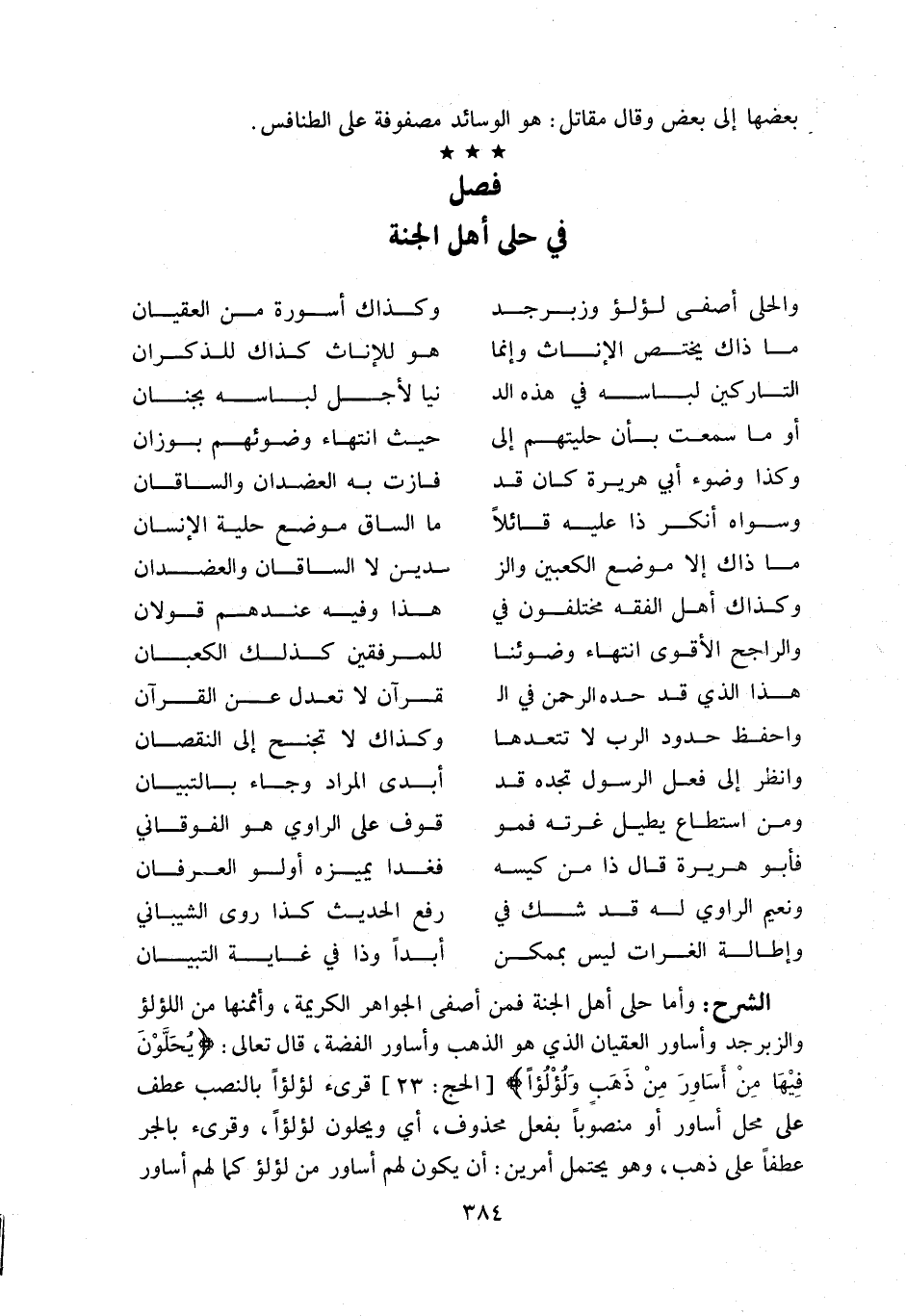 وأما حلى أهل الجنة فمن أصفى الجواهر الكريمة، وأثمنها من اللؤلؤ والزبرجد وأساور العقيان الذي هو الذهب وأساور الفضة، قال تعالى: يُحَلَّوْنَ فِيها مِنْ أَساوِرَ مِنْ ذَهَبٍ ولُؤْلُؤاً [الحج: 23] قرئ لؤلؤا بالنصب عطف على محل أساور أو منصوبا بفعل محذوف، أي ويحلون لؤلؤا، وقرئ بالجر عطفا على ذهب، وهو يحتمل أمرين: أن يكون لهم أساور من لؤلؤ كما لهم أساور