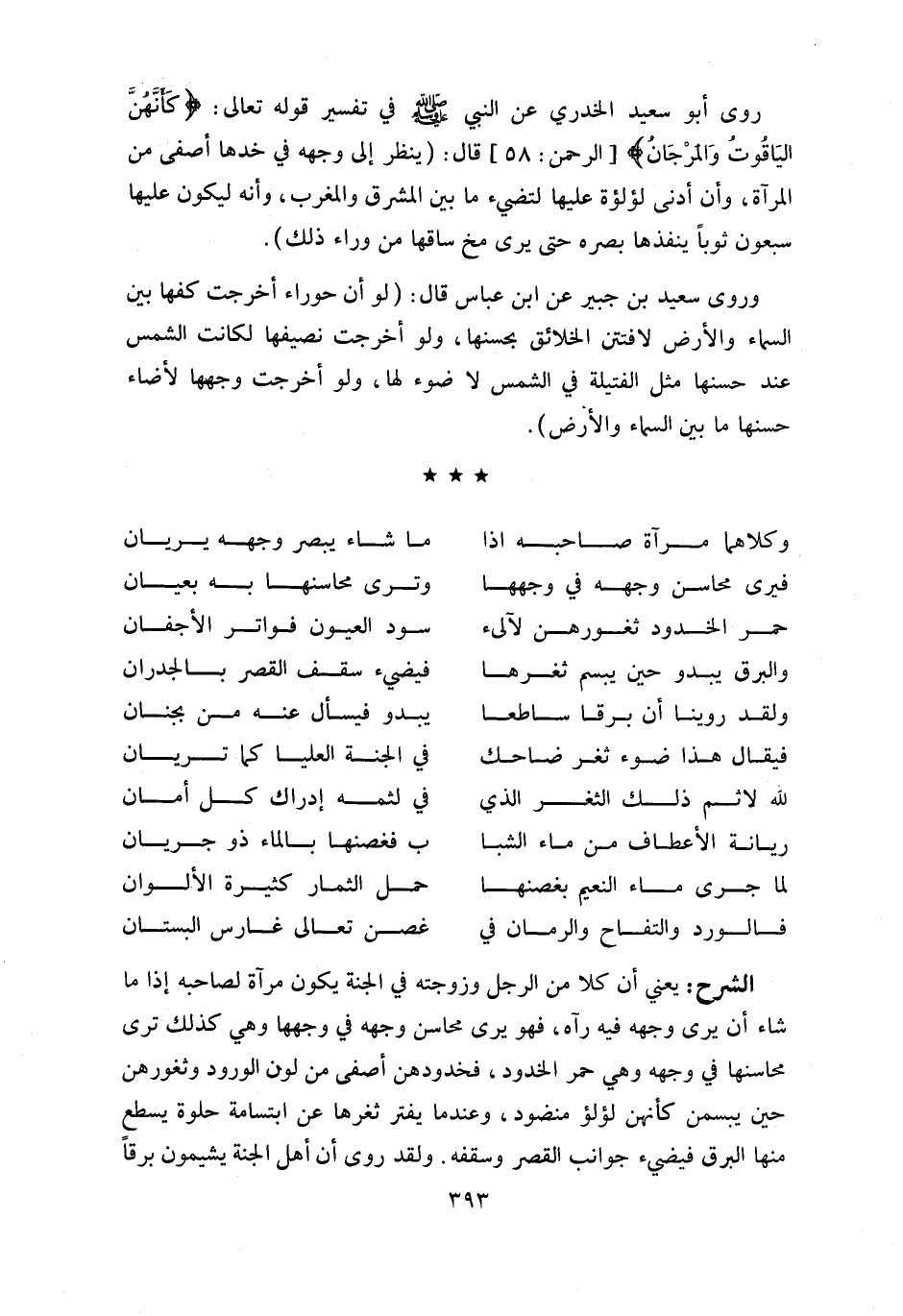 يعني أن كلا من الرجل وزوجته في الجنة يكون مرآة لصاحبه إذا ما شاء أن يرى وجهه فيه رآه، فهو يرى محاسن وجهه في وجهها وهي كذلك ترى محاسنها في وجهه وهي حمر الخدود، فخدودهن أصفى من لون الورود وثغورهن حين يبسمن كأنهن لؤلؤ منضود، وعند ما يفتر ثغرها عن ابتسامة حلوة يسطع منها البرق فيضي ء جوانب القصر وسقفه. ولقد روى أن أهل الجنة يشيمون برقا