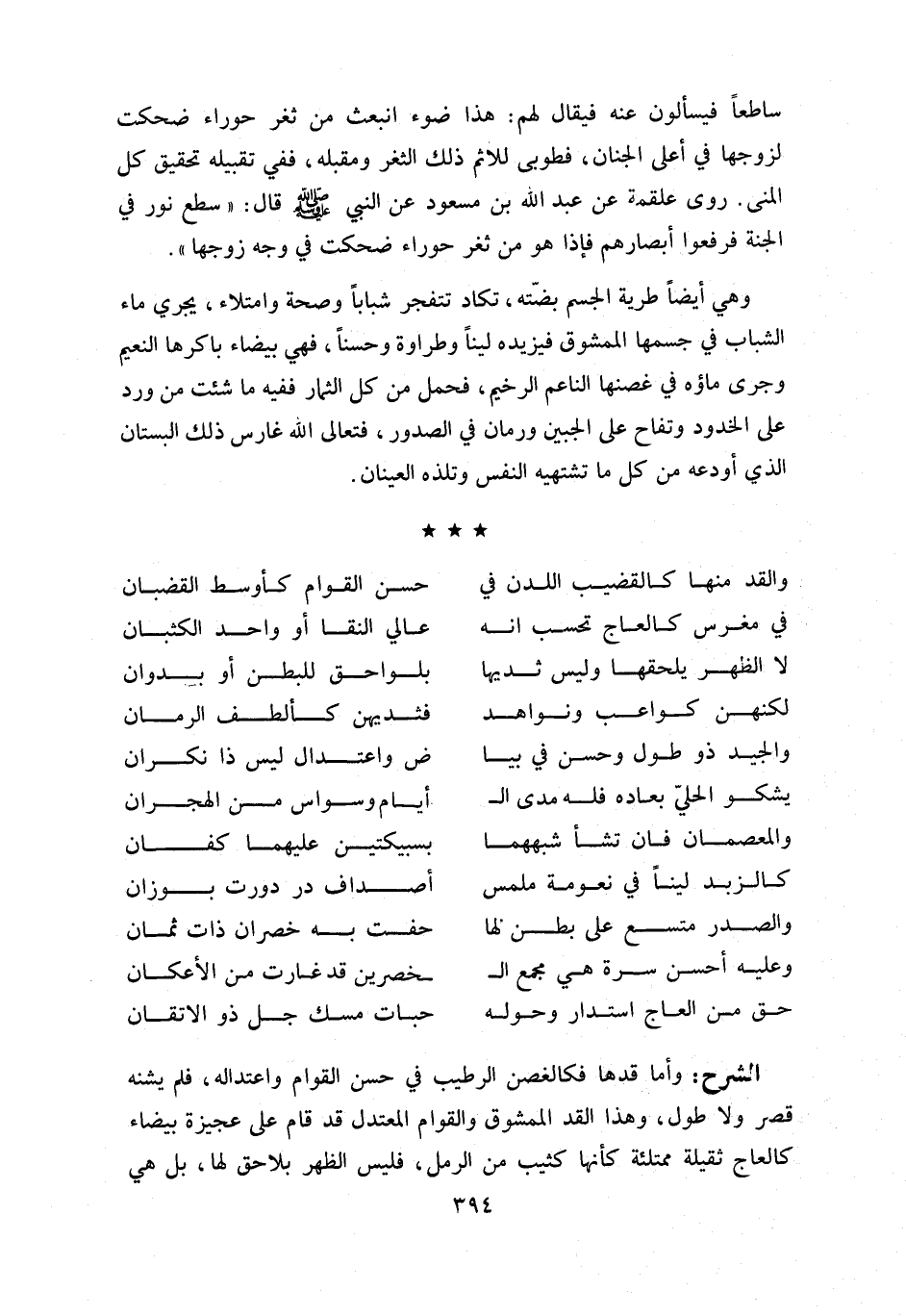 ساطعا فيسألون عنه فيقال لهم: هذا ضوء انبعث من ثغر حوراء ضحكت لزوجها في أعلى الجنان، فطوبى للاثم ذلك الثغر ومقبله، ففي تقبيله تحقيق كل المنى. روى علقمة عن عبد اللّه بن مسعود عن النبي صلّى اللّه عليه وسلّم قال: «سطع نور في الجنة فرفعوا أبصارهم فإذا هو من ثغر حوراء ضحكت في وجه زوجها».