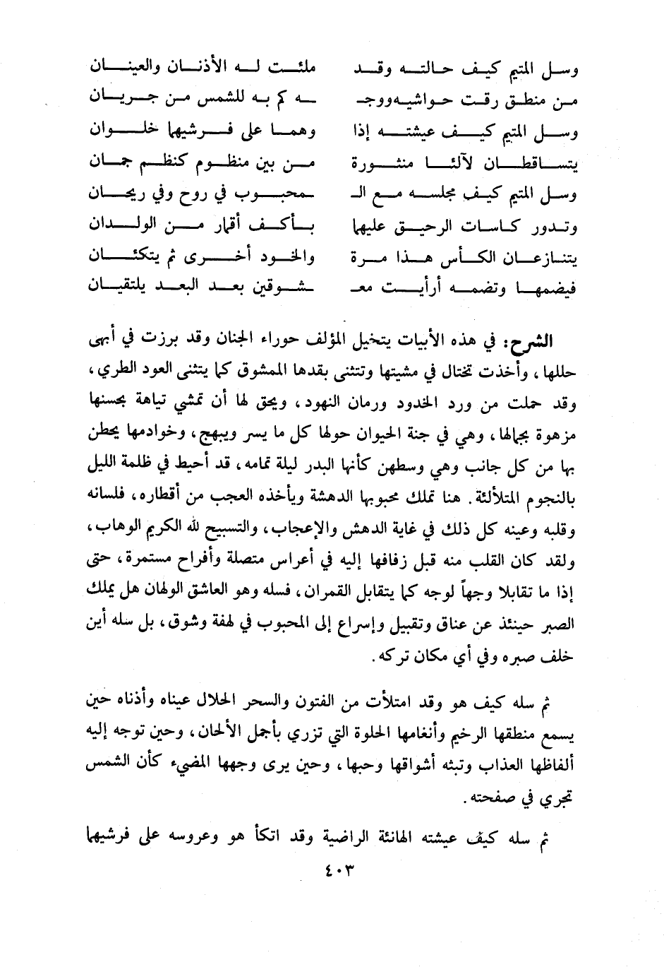 في هذه الأبيات يتخيل المؤلف حوراء الجنان وقد برزت في أبهى حللها، وأخذت تختال في مشيتها وتتثنى بقدها الممشوق كما يتثنى العود الطري، وقد حملت من ورد الخدود ورمان النهود، ويحق لها أن تمشي تياهة بحسنها مزهوة بجمالها، وهي في جنة الحيوان حولها كل ما يسر ويبهج، وخوادمها يحطن بها من كل جانب وهي وسطهن كأنها البدر ليلة تمامه، قد أحيط في ظلمة الليل بالنجوم المتلألئة. هنا تملك محبوبها الدهشة ويأخذه العجب من أقطاره، فلسانه وقلبه وعينه كل ذلك في غاية الدهش والإعجاب، والتسبيح للّه الكريم الوهاب، ولقد كان القلب منه قبل زفافها إليه في أعراس متصلة وأفراح مستمرة، حتى إذا ما تقابلا وجها لوجه كما يتقابل القمران، فسله وهو العاشق الولهان هل يملك الصبر حينئذ عن عناق وتقبيل وإسراع إلى المحبوب في لهفة وشوق، بل سله أين خلف صبره وفي أي مكان تركه.