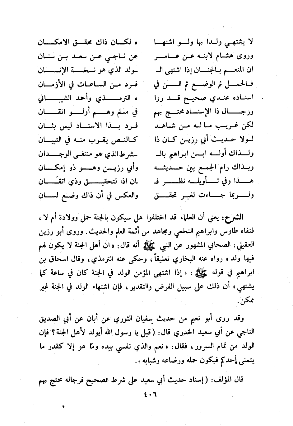 و قد روى أبو نعيم من حديث سفيان الثوري عن أبان عن أبي الصديق الناجي عن أبي سعيد الخدري قال: (قيل يا رسول اللّه أ يولد لأهل الجنة؟ فإن الولد من تمام السرور، فقال: «نعم والذي نفسي بيده وما هو إلا كقدر ما يتمنى أحدكم فيكون حمله ورضاعه وشبابه».