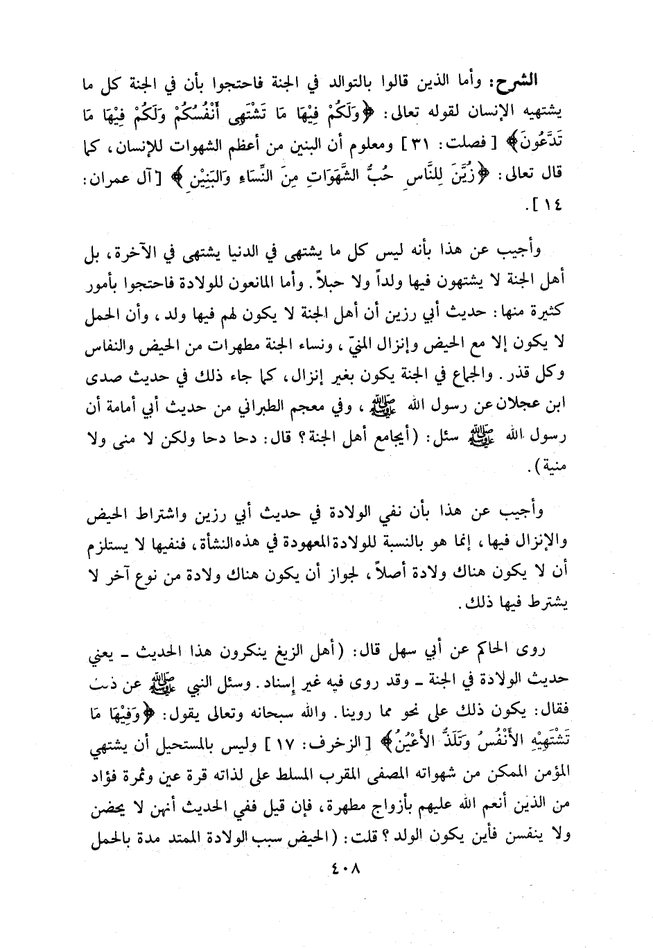روى الحاكم عن أبي سهل قال: (أهل الزيغ ينكرون هذا الحديث- يعني حديث الولادة في الجنة- وقد روى فيه غير إسناد. وسئل النبي صلّى اللّه عليه وسلّم عن ذلك فقال: يكون ذلك على نحو مما روينا. واللّه سبحانه وتعالى يقول: وفِيها ما تَشْتَهِيهِ الْأَنْفُسُ وتَلَذُّ الْأَعْيُنُ [الزخرف: 17] وليس بالمستحيل أن يشتهي المؤمن الممكن من شهواته المصفى المقرب المسلط على لذاته قرة عين وثمرة فؤاد من الذين أنعم اللّه عليهم بأزواج مطهرة، فإن قيل ففي الحديث أنهن لا يحضن ولا ينفسن فأين يكون الولد؟ قلت: (الحيض سبب الولادة الممتد مدة بالحمل