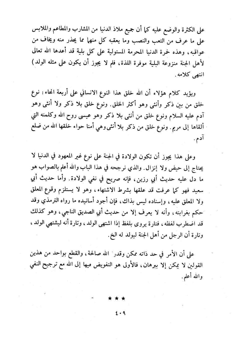 و على هذا يجوز أن تكون الولادة في الجنة على نوع غير المعهود في الدنيا لا يحتاج إلى حيض ولا إنزال. والذي نرجحه في هذا الباب واللّه أعلم بالصواب هو ما دل عليه حديث أبي رزين، فإنه صريح في نفي الولادة. وأما حديث أبي سعيد فهو كما عرفت قد علقها بشرط الاشتهاء، وهو لا يستلزم وقوع المعلق ولا المعلق عليه، وإسناده ليس بذاك، فإن أجود أسانيده ما رواه الترمذي وقد حكم بغرابته، وأنه لا يعرف إلا من حديث أبي الصديق الناجي، وهو كذلك قد اضطرب لفظه، فتارة يروى بلفظ إذا اشتهى الولد، وتارة أنه ليشتهي الولد، وتارة أن الرجل من أهل الجنة ليولد له الخ.