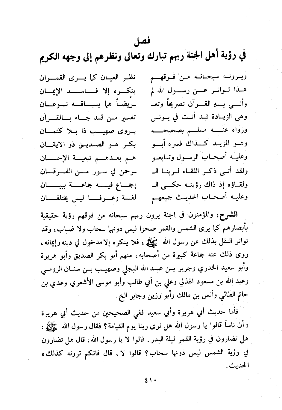 والمؤمنون في الجنة يرون ربهم سبحانه من فوقهم رؤية حقيقية بأبصارهم كما يرى الشمس والقمر صحوا ليس دونهما سحاب ولا ضباب، وقد تواتر النقل بذلك عن رسول اللّه صلّى اللّه عليه وسلّم، فلا ينكره إلا مدخول في دينه وإيمانه، روى ذلك عنه جماعة كبيرة من أصحابه، منهم أبو بكر الصديق وأبو هريرة وأبو سعيد الخدري وجرير بن عبد اللّه البجلي وصهيب بن سنان الرومي وعبد اللّه بن مسعود الهذلي وعلي بن أبي طالب وأبو موسى الأشعري وعدي بن حاتم الطائي وأنس بن مالك وأبو رزين وجابر الخ.