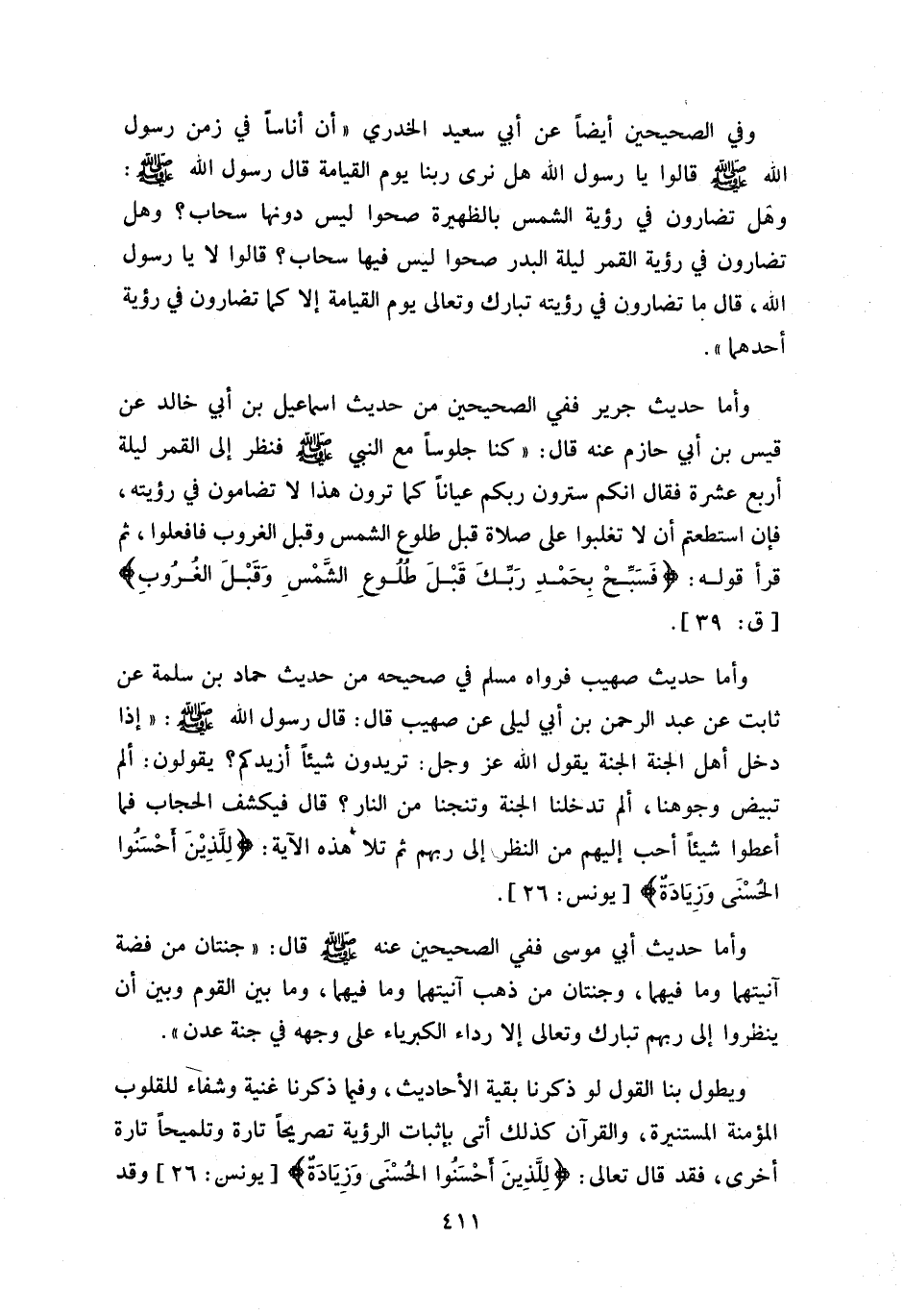 و يطول بنا القول لو ذكرنا بقية الأحاديث، وفيما ذكرنا غنية وشفاء للقلوب المؤمنة المستنيرة، والقرآن كذلك أتى بإثبات الرؤية تصريحا تارة وتلميحا تارة أخرى، فقد قال تعالى: لِلَّذِينَ أَحْسَنُوا الْحُسْنى وزِيادَةٌ [يونس: 26] وقد