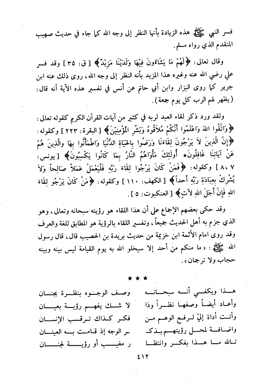 و قال تعالى: لَهُمْ ما يَشاؤُنَ فِيها ولَدَيْنا مَزِيدٌ [ق: 35] وقد فسر علي رضي اللّه عنه وغيره هذا المزيد بأنه النظر إلى وجه اللّه، روى ذلك عنه ابن جرير كما روى البزار وابن أبي حاتم عن أنس في تفسير هذه الآية أنه قال: