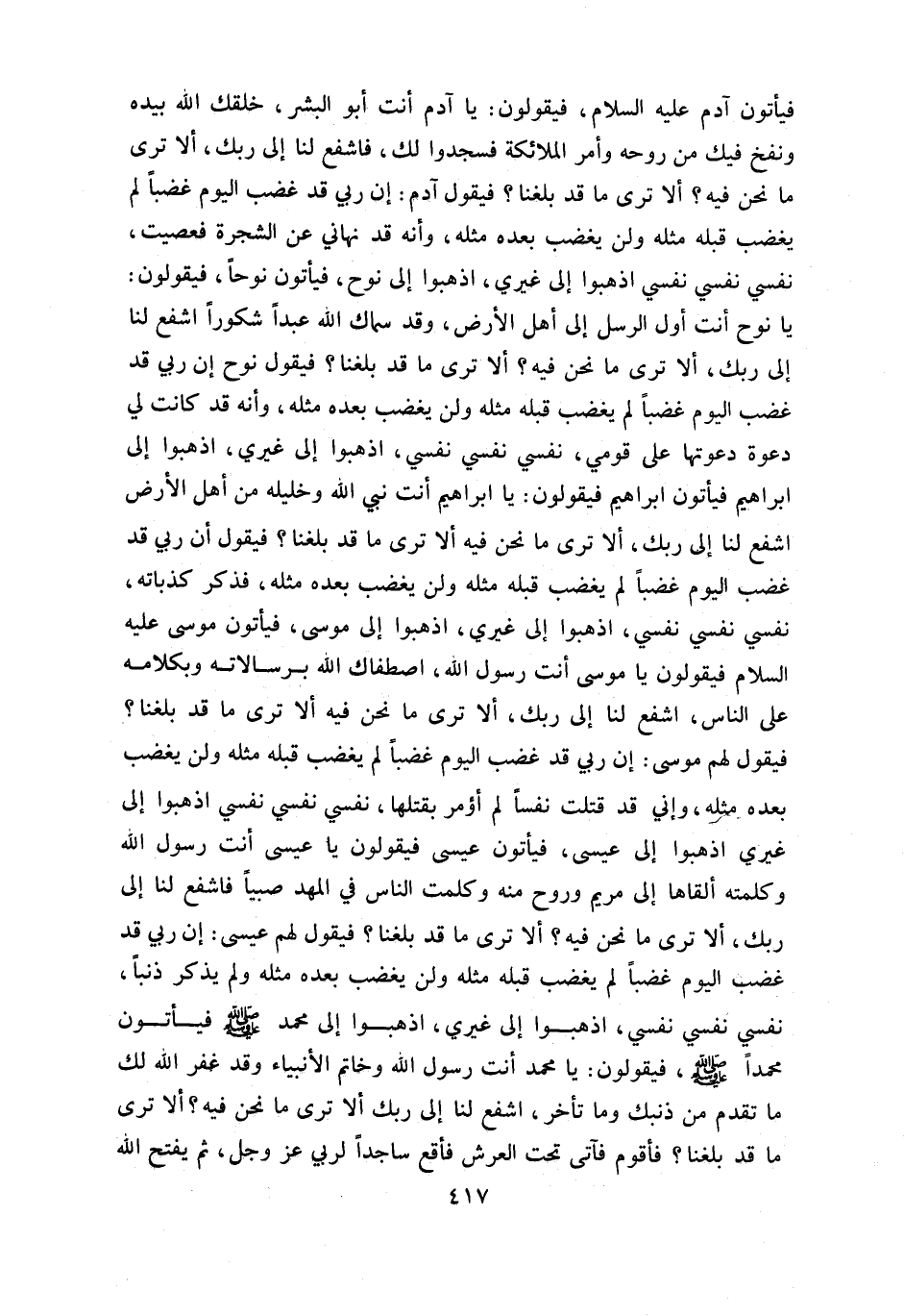 يا نوح أنت أول الرسل إلى أهل الأرض، وقد سماك اللّه عبدا شكورا اشفع لنا إلى ربك، ألا ترى ما نحن فيه؟ ألا ترى ما قد بلغنا؟ فيقول نوح إن ربي قد غضب اليوم غضبا لم يغضب قبله مثله ولن يغضب بعده مثله، وأنه قد كانت لي دعوة دعوتها على قومي، نفسي نفسي نفسي، اذهبوا إلى غيري، اذهبوا إلى ابراهيم فيأتون ابراهيم فيقولون: يا ابراهيم أنت نبي اللّه وخليله من أهل الأرض اشفع لنا إلى ربك، ألا ترى ما نحن فيه ألا ترى ما قد بلغنا؟ فيقول أن ربي قد غضب اليوم غضبا لم يغضب قبله مثله ولن يغضب بعده مثله، فذكر كذباته، نفسي نفسي نفسي، اذهبوا إلى غيري، اذهبوا إلى موسى، فيأتون موسى عليه السلام فيقولون يا موسى أنت رسول اللّه، اصطفاك اللّه برسالاته وبكلامه على الناس، اشفع لنا إلى ربك، ألا ترى ما نحن فيه ألا ترى ما قد بلغنا؟
