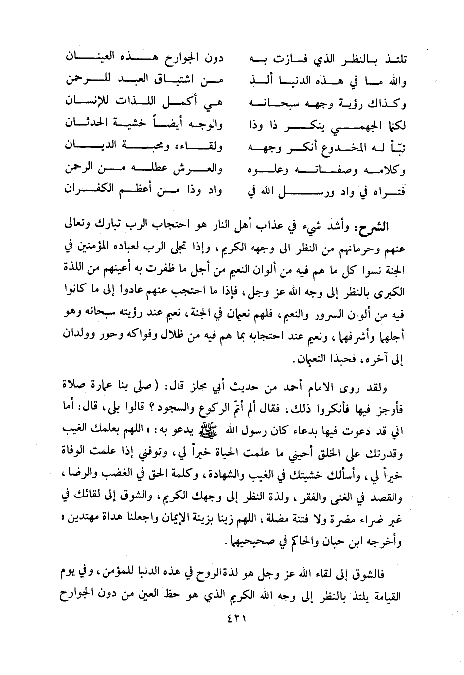 وأشد شي ء في عذاب أهل النار هو احتجاب الرب تبارك وتعالى عنهم وحرمانهم من النظر الى وجهه الكريم، وإذا تجلى الرب لعباده المؤمنين في الجنة نسوا كل ما هم فيه من ألوان النعيم من أجل ما ظفرت به أعينهم من اللذة الكبرى بالنظر إلى وجه اللّه عز وجل، فإذا ما احتجب عنهم عادوا إلى ما كانوا فيه من ألوان السرور والنعيم، فلهم نعيمان في الجنة، نعيم عند رؤيته سبحانه وهو أجلهما وأشرفهما، ونعيم عند احتجابه بما هم فيه من ظلال وفواكه وحور وولدان إلى آخره، فحبذا النعيمان.