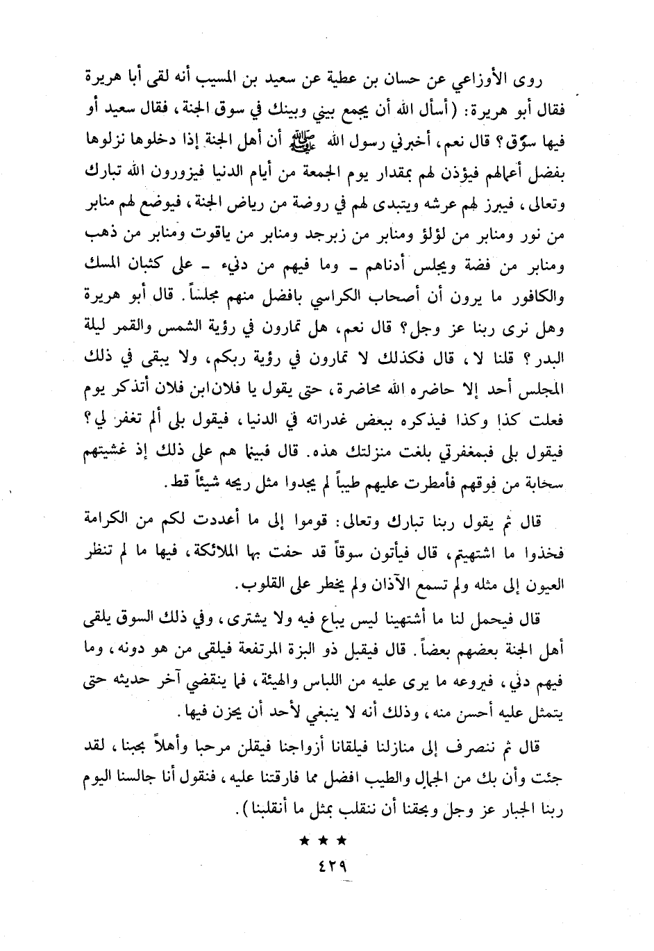 روى الأوزاعي عن حسان بن عطية عن سعيد بن المسيب أنه لقى أبا هريرة فقال أبو هريرة: (أسأل اللّه أن يجمع بيني وبينك في سوق الجنة، فقال سعيد أو فيها سوق؟ قال نعم، أخبرني رسول اللّه صلّى اللّه عليه وسلّم أن أهل الجنة إذا دخلوها نزلوها بفضل أعمالهم فيؤذن لهم بمقدار يوم الجمعة من أيام الدنيا فيزورون اللّه تبارك وتعالى، فيبرز لهم عرشه ويتبدى لهم في روضة من رياض الجنة، فيوضع لهم منابر من نور ومنابر من لؤلؤ ومنابر من زبرجد ومنابر من ياقوت ومنابر من ذهب ومنابر من فضة ويجلس أدناهم- وما فيهم من دني ء- على كثبان المسك والكافور ما يرون أن أصحاب الكراسي بافضل منهم مجلسا. قال أبو هريرة وهل نرى ربنا عز وجل؟ قال نعم، هل تمارون في رؤية الشمس والقمر ليلة البدر؟ قلنا لا، قال فكذلك لا تمارون في رؤية ربكم، ولا يبقى في ذلك المجلس أحد إلا حاضره اللّه محاضرة، حتى يقول يا فلان ابن فلان أتذكر يوم فعلت كذا وكذا فيذكره ببعض غدراته في الدنيا، فيقول بلى أ لم تغفر لي؟