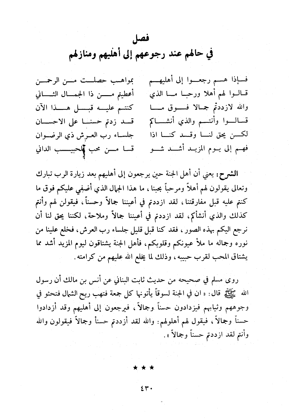يعني أن أهل الجنة حين يرجعون إلى أهليهم بعد زيارة الرب تبارك وتعالى يقولون لهم أهلا ومرحبا بحبنا، ما هذا الجمال الذي أضفي عليكم فوق ما كنتم عليه قبل مفارقتنا، لقد ازددتم في أعيننا جمالا وحسنا، فيقولن لهم وأنتم كذلك والذي أنشأكم، لقد ازددتم في أعيننا جمالا وملاحة، لكننا يحق لنا أن نرجع إليكم بهذه الصور، فقد كنا قبل قليل جلساء رب العرش، فخلع علينا من نوره وجماله ما ملأ عيونكم وقلوبكم، فأهل الجنة يشتاقون ليوم المزيد أشد مما يشتاق المحب لقرب حبيبه، وذلك لما يخلع اللّه عليهم من كرامته.