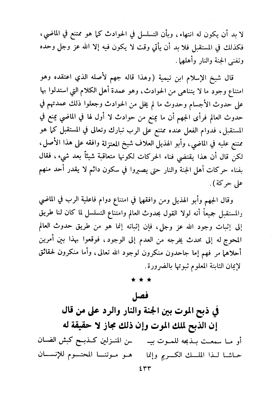 لا بد أن يكون له انتهاء، وبأن التسلسل في الحوادث كما هو ممتنع في الماضي، فكذلك في المستقبل فلا بد أن يأتي وقت لا يكون فيه إلا اللّه عز وجل وحده وتفنى الجنة والنار وأهلهما.