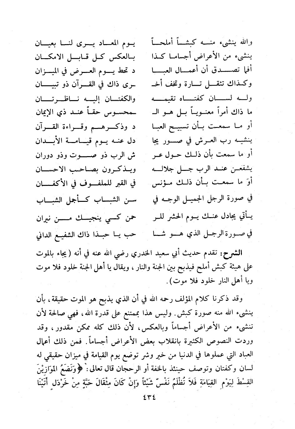 و قد ذكرنا كلام المؤلف رحمه اللّه في أن الذي يذبح هو الموت حقيقة، بأن ينشئ اللّه منه صورة كبش. وليس هذا بممتنع على قدرة اللّه، فهي صالحة لأن تنشئ من الأعراض أجساما وبالعكس، لأن ذلك كله ممكن مقدور، وقد وردت النصوص الكثيرة بانقلاب بعض الأعراض أجساما. فمن ذلك أعمال العباد التي عملوها في الدنيا من خير وشر توضع يوم القيامة في ميزان حقيقي له لسان وكفتان وتوصف حينئذ بالخفة أو الرجحان قال تعالى: ونَضَعُ الْمَوازِينَ الْقِسْطَ لِيَوْمِ الْقِيامَةِ فَلا تُظْلَمُ نَفْسٌ شَيْئاً وإِنْ كانَ مِثْقالَ حَبَّةٍ مِنْ خَرْدَلٍ أَتَيْنا