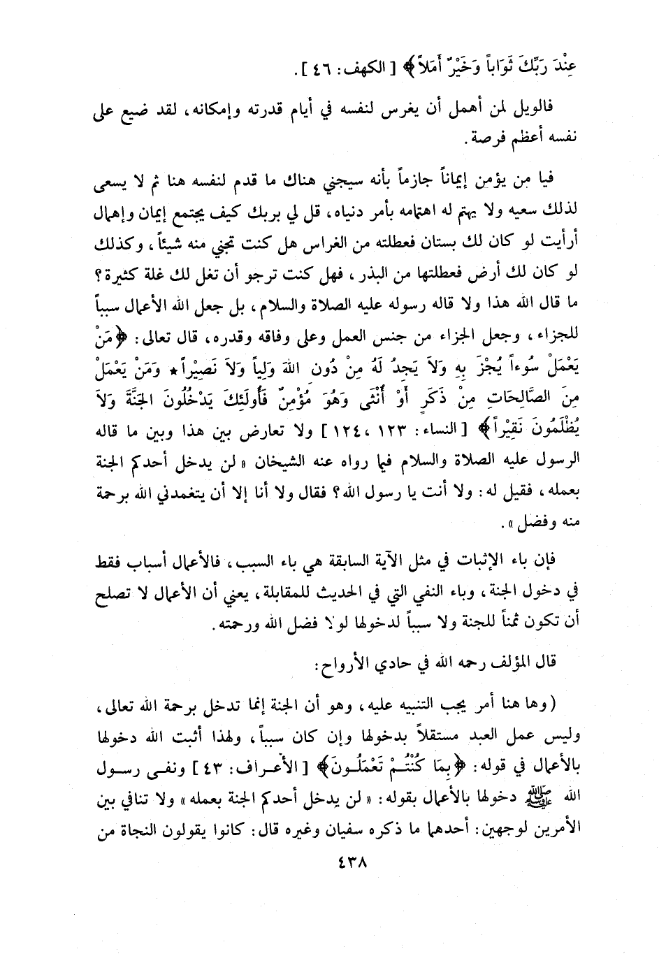 (و هاهنا أمر يجب التنبيه عليه، وهو أن الجنة إنما تدخل برحمة اللّه تعالى، وليس عمل العبد مستقلا بدخولها وإن كان سببا، ولهذا أثبت اللّه دخولها بالأعمال في قوله: بِما كُنْتُمْ تَعْمَلُونَ [الأعراف: 43] ونفى رسول اللّه صلّى اللّه عليه وسلّم دخولها بالأعمال بقوله: «لن يدخل أحدكم الجنة بعمله» ولا تنافي بين الأمرين لوجهين: أحدهما ما ذكره سفيان وغيره قال: كانوا يقولون النجاة من