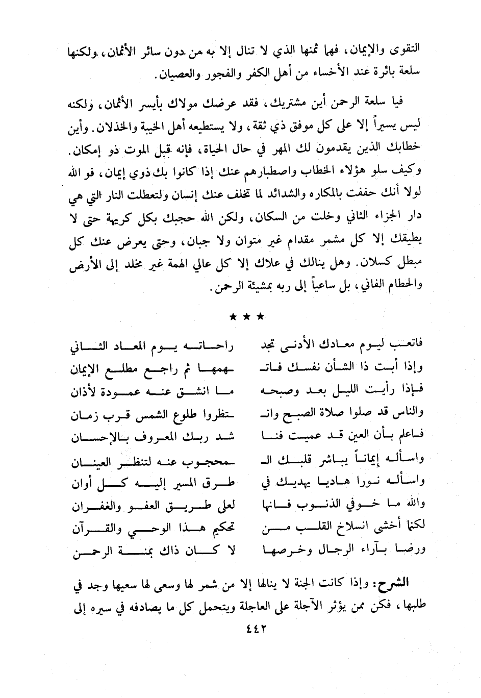 فيا سلعة الرحمن أين مشتريك، فقد عرضك مولاك بأيسر الأثمان، ولكنه ليس يسيرا إلا على كل موفق ذي ثقة، ولا يستطيعه أهل الخيبة والخذلان. وأين خطابك الذين يقدمون لك المهر في حال الحياة، فإنه قبل الموت ذو إمكان.
