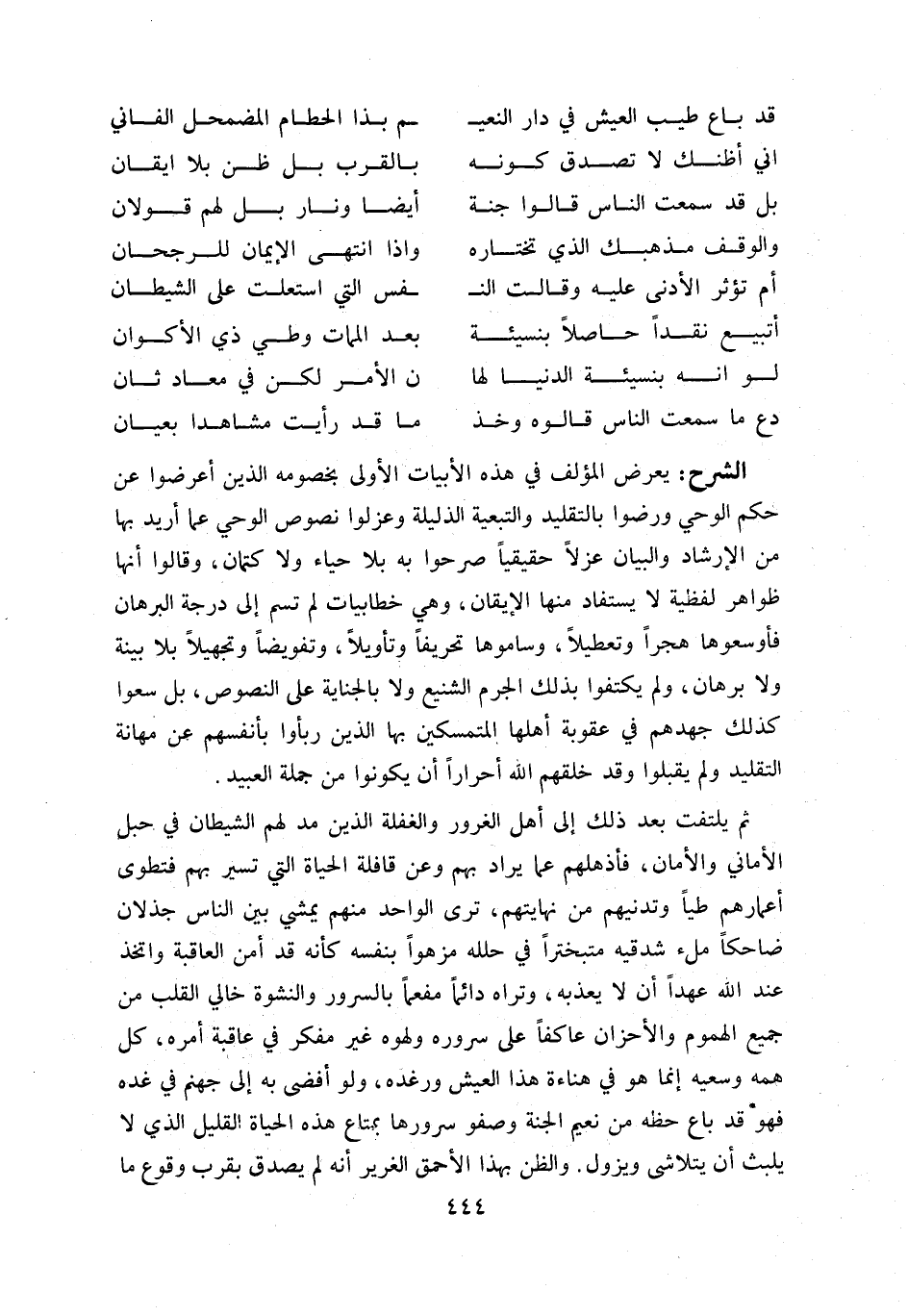 يعرض المؤلف في هذه الأبيات الأولى بخصومه الذين أعرضوا عن حكم الوحي ورضوا بالتقليد والتبعية الذليلة وعزلوا نصوص الوحي عما أريد بها من الإرشاد والبيان عزلا حقيقيا صرحوا به بلا حياء ولا كتمان، وقالوا أنها ظواهر لفظية لا يستفاد منها الإيقان، وهي خطابيات لم تسم إلى درجة البرهان فأوسعوها هجرا وتعطيلا، وساموها تحريفا وتأويلا، وتفويضا وتجهيلا بلا بينة ولا برهان، ولم يكتفوا بذلك الجرم الشنيع ولا بالجناية على النصوص، بل سعوا كذلك جهدهم في عقوبة أهلها المتمسكين بها الذين ربئوا بأنفسهم عن مهانة التقليد ولم يقبلوا وقد خلقهم اللّه أحرارا أن يكونوا من جملة العبيد.
