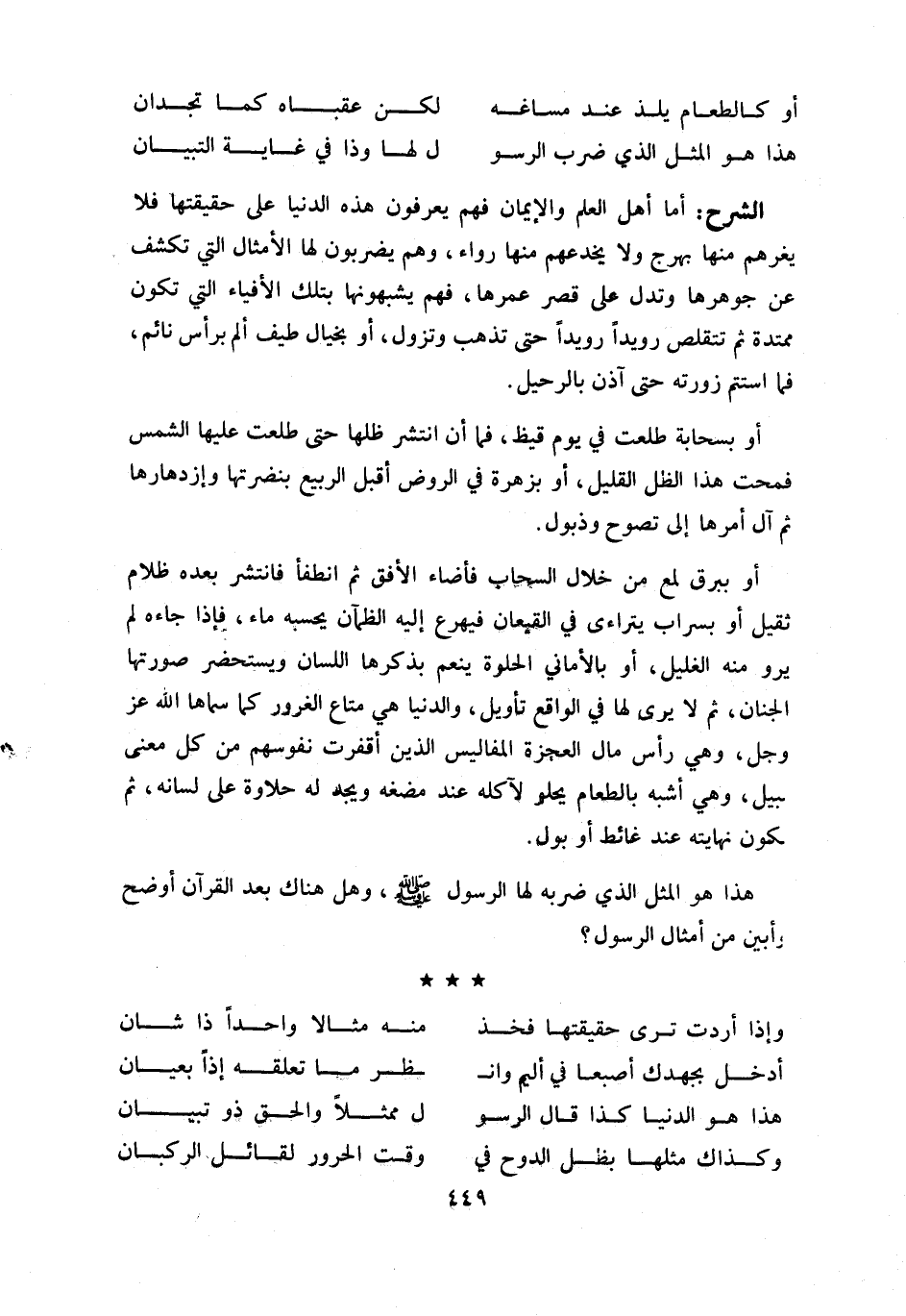 أو ببرق لمع من خلال السحاب فأضاء الأفق ثم انطفأ فانتشر بعده ظلام ثقيل أو بسراب يتراءى في القيعان فيهرع إليه الظمآن يحسبه ماء، فإذا جاءه لم يرو منه الغليل، أو بالأماني الحلوة ينعم بذكرها اللسان ويستحضر صورتها الجنان، ثم لا يرى لها في الواقع تأويل، والدنيا هي متاع الغرور كما سماها اللّه عز وجل، وهي رأس مال العجزة المفاليس الذين أقفرت نفوسهم من كل معنى سبيل، وهي أشبه بالطعام يحلو لآكله عند مضغه ويجد له حلاوة على لسانه، ثم يكون نهايته عند غائط أو بول.