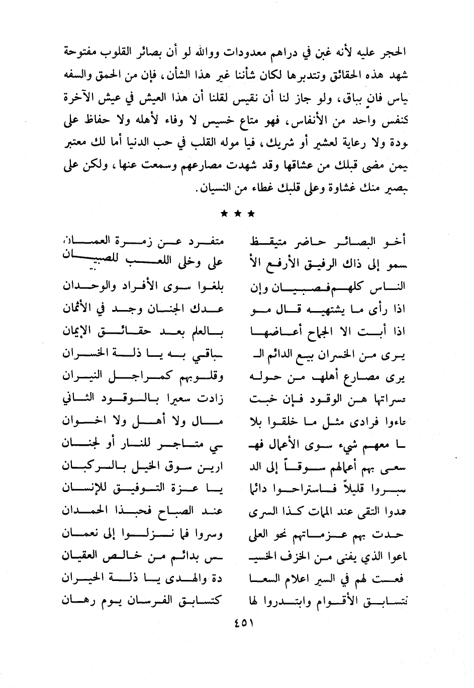 و الحجر عليه لأنه غبن في دراهم معدودات وو اللّه لو أن بصائر القلوب مفتوحة تشهد هذه الحقائق وتتدبرها لكان شأننا غير هذا الشأن، فإن من الحمق والسفه قياس فان بباق، ولو جاز لنا أن نقيس لقلنا أن هذا العيش في عيش الآخرة كنفس واحد من الأنفاس، فهو متاع خسيس لا وفاء لأهله ولا حفاظ على مودة ولا رعاية لعشير أو شريك، فيا موله القلب في حب الدنيا أ ما لك معتبر فيمن مضى قبلك من عشاقها وقد شهدت مصارعهم وسمعت عنها، ولكن على تبصير منك غشاوة وعلى قلبك غطاء من النسيان.