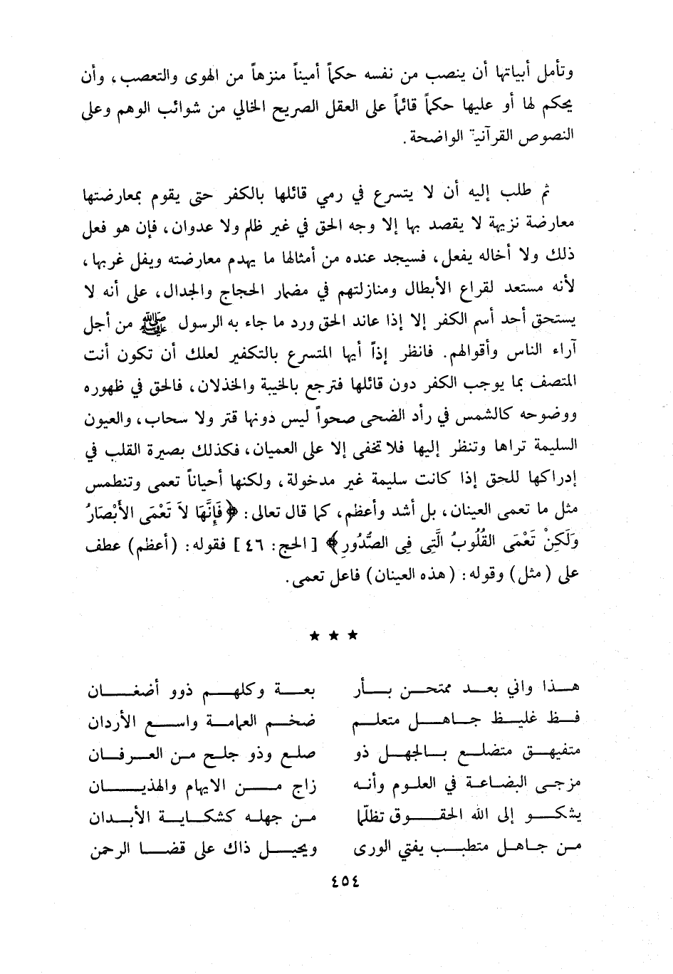 و تأمل أبياتها أن ينصب من نفسه حكما أمينا منزها من الهوى والتعصب، وأن يحكم لها أو عليها حكما قائما على العقل الصريح الخالي من شوائب الوهم وعلى النصوص القرآنية الواضحة.