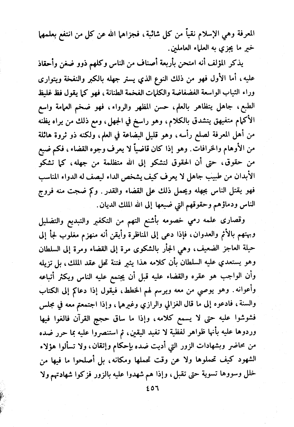 يذكر المؤلف أنه امتحن بأربعة أصناف من الناس وكلهم ذوو ضغن وأحقاد عليه، أما الأول فهو من ذلك النوع الذي يستر جهله بالكبر والنفخة ويتوارى وراء الثياب الواسعة الفضفاضة والكلمات الفخمة الطنانة، فهو كما يقول فظ غليظ الطبع، جاهل يتظاهر بالعلم، حسن المظهر والرواء، فهو ضخم العمامة واسع الأكمام متفيهق يتشدق بالكلام، وهو راسخ في الجهل، ومع ذلك من يراه يظنه من أهل المعرفة لصلع رأسه، وهو قليل البضاعة في العلم، ولكنه ذو ثروة هائلة من الأوهام والخرافات. وهو إذا كان قاضيا لا يعرف وجوه القضاء، فكم ضيع من حقوق، حتى أن الحقوق لتشكو إلى اللّه متظلمة من جهله، كما تشكو الأبدان من طبيب جاهل لا يعرف كيف يشخص الداء ليصف له الدواء المناسب فهو يقتل الناس بجهله ويحمل ذلك على القضاء والقدر. وكم ضجت منه فروج الناس ودماؤهم وحقوقهم التي ضيعها إلى اللّه الملك الديان.