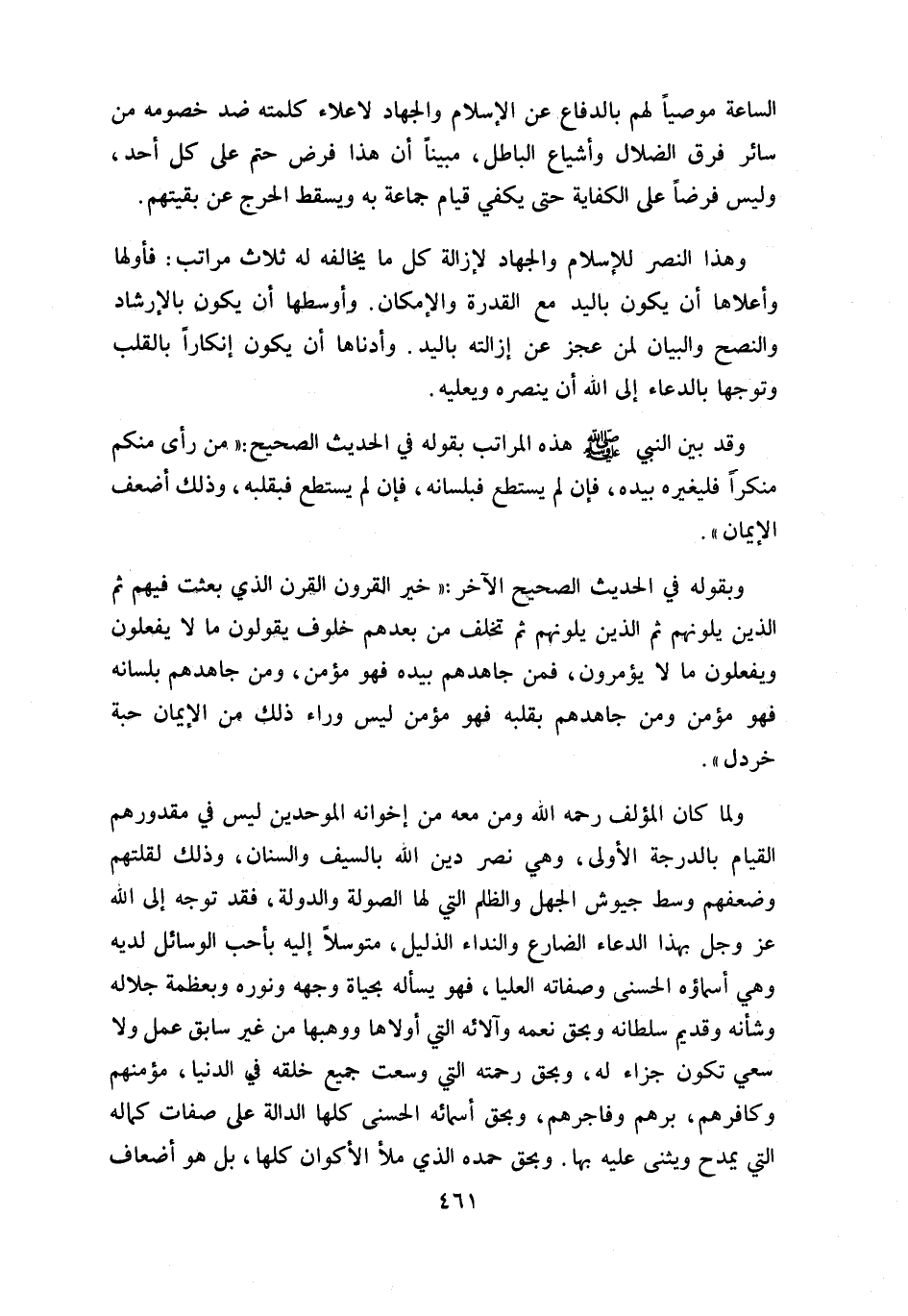 و بقوله في الحديث الصحيح الآخر: «خير القرون القرن الذي بعثت فيهم ثم الذين يلونهم ثم الذين يلونهم ثم تخلف من بعدهم خلوف يقولون ما لا يفعلون ويفعلون ما لا يؤمرون، فمن جاهدهم بيده فهو مؤمن، ومن جاهدهم بلسانه فهو مؤمن ومن جاهدهم بقلبه فهو مؤمن ليس وراء ذلك من الإيمان حبة خردل».