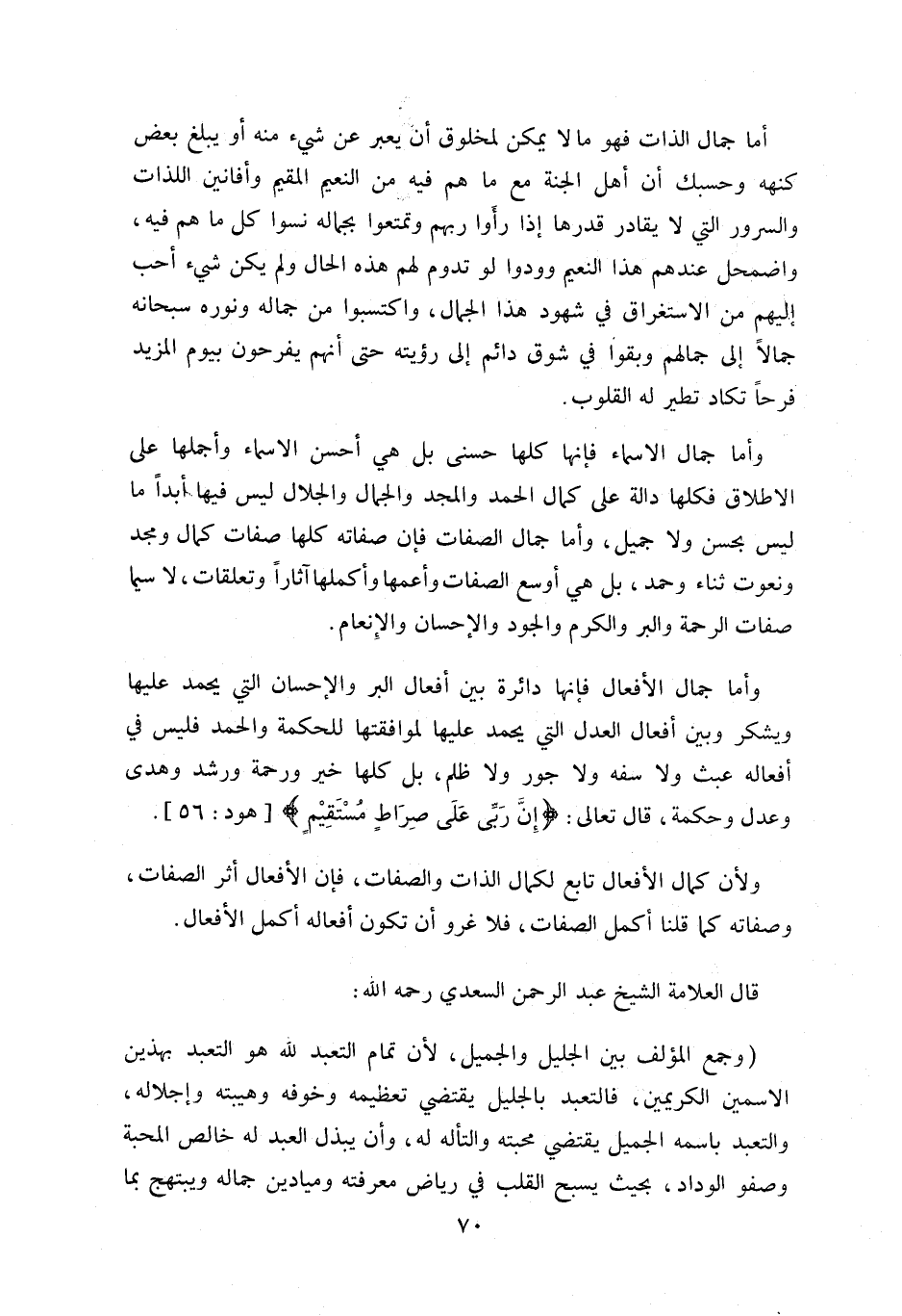 و أما جمال الأفعال فإنها دائرة بين أفعال البر والإحسان التي يحمد عليها ويشكر وبين أفعال العدل التي يحمد عليها لموافقتها للحكمة والحمد فليس في أفعاله عبث ولا سفه ولا جور ولا ظلم، بل كلها خير ورحمة ورشد وهدى وعدل وحكمة، قال تعالى: إِنَّ رَبِّي عَلى صِراطٍ مُسْتَقِيمٍ [هود: 56].