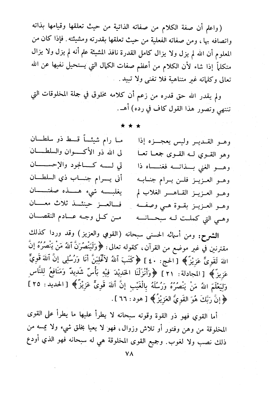 (و اعلم أن صفة الكلام من صفاته الذاتية من حيث تعلقها وقيامها بذاته واتصافه بها، ومن صفاته الفعلية من حيث تعلقها بقدرته ومشيئته. فإذا كان من المعلوم أن اللّه لم يزل ولا يزال كامل القدرة نافذ المشيئة علم أنه لم يزل ولا يزال متكلما إذا شاء لأن الكلام من أعظم صفات الكمال التي يستحيل نفيها عن اللّه تعالى وكلماته غير متناهية فلا تفنى ولا تبيد.