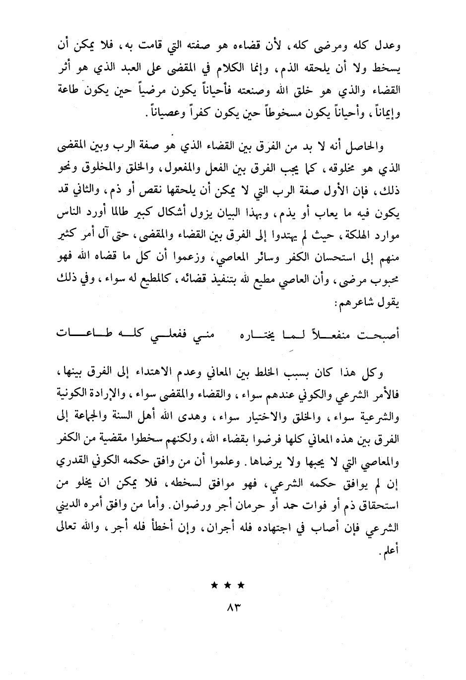 و الحاصل أنه لا بد من الفرق بين القضاء الذي هو صفة الرب وبين المقضى الذي هو مخلوقه، كما يجب الفرق بين الفعل والمفعول، والخلق والمخلوق ونحو ذلك، فإن الأول صفة الرب التي لا يمكن أن يلحقها نقص أو ذم، والثاني قد يكون فيه ما يعاب أو يذم، وبهذا البيان يزول أشكال كبير طالما أورد الناس موارد الهلكة، حيث لم يهتدوا إلى الفرق بين القضاء والمقضى، حتى آل أمر كثير منهم إلى استحسان الكفر وسائر المعاصي، وزعموا أن كل ما قضاه اللّه فهو محبوب مرضى، وأن العاصي مطيع للّه بتنفيذ قضائه، كالمطيع له سواء، وفي ذلك يقول شاعرهم: