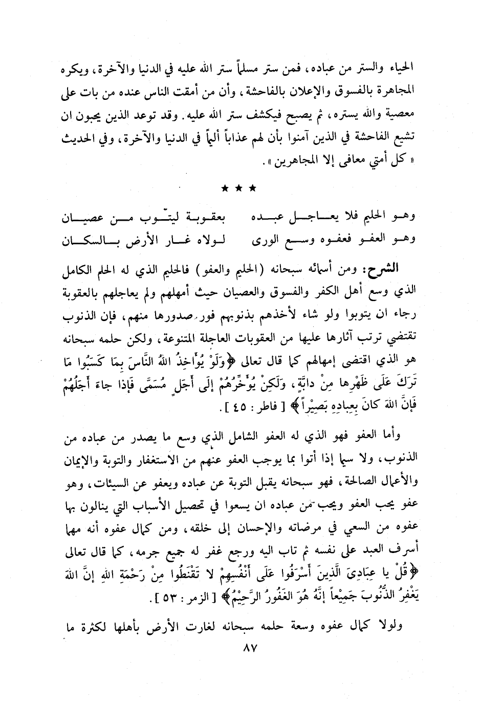 و أما العفو فهو الذي له العفو الشامل الذي وسع ما يصدر من عباده من الذنوب، ولا سيما إذا أتوا بما يوجب العفو عنهم من الاستغفار والتوبة والإيمان والأعمال الصالحة، فهو سبحانه يقبل التوبة عن عباده ويعفو عن السيئات، وهو عفو يحب العفو ويحب من عباده ان يسعوا في تحصيل الأسباب التي ينالون بها عفوه من السعي في مرضاته والإحسان إلى خلقه، ومن كمال عفوه أنه مهما أسرف العبد على نفسه ثم تاب إليه ورجع غفر له جميع جرمه، كما قال تعالى قُلْ يا عِبادِيَ الَّذِينَ أَسْرَفُوا عَلى أَنْفُسِهِمْ لا تَقْنَطُوا مِنْ رَحْمَةِ اللَّهِ إِنَّ اللَّهَ يَغْفِرُ الذُّنُوبَ جَمِيعاً إِنَّهُ هُوَ الْغَفُورُ الرَّحِيمُ [الزمر: 53].